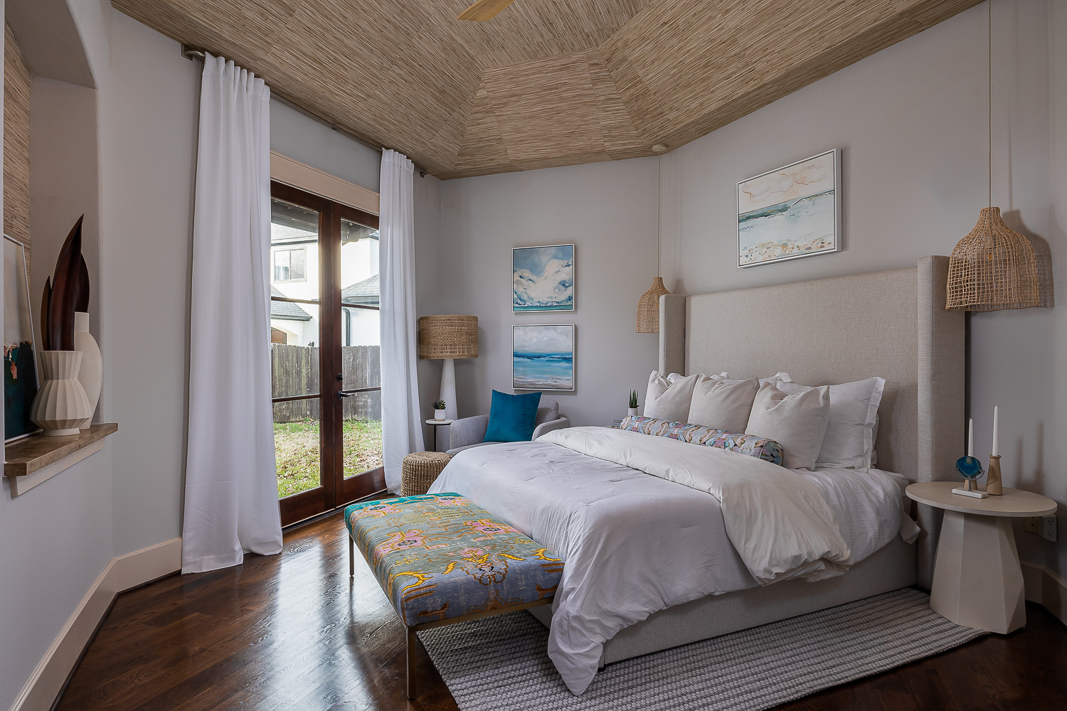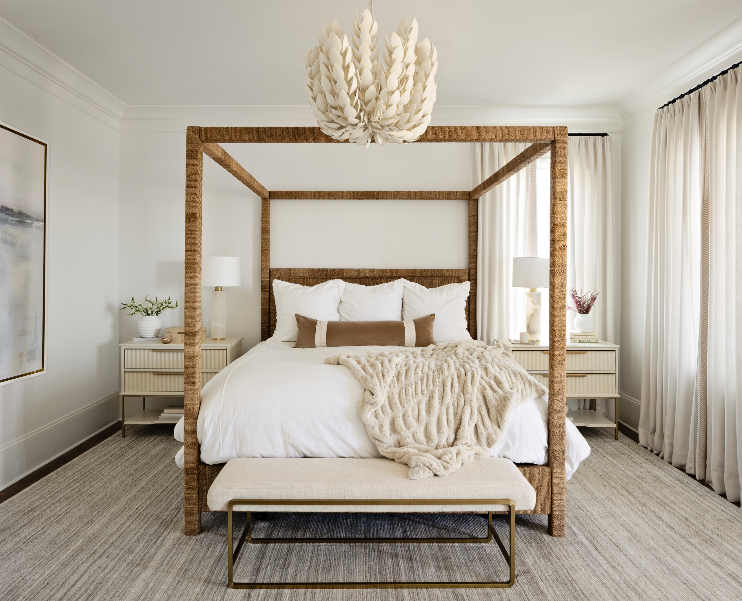 In this Nashville, Tennessee, bedroom, designer Stephanie Ervin used a natural seagrass rope-wrapped canopy bed to add dimension, texture and interest to the soothing modern-organic space.