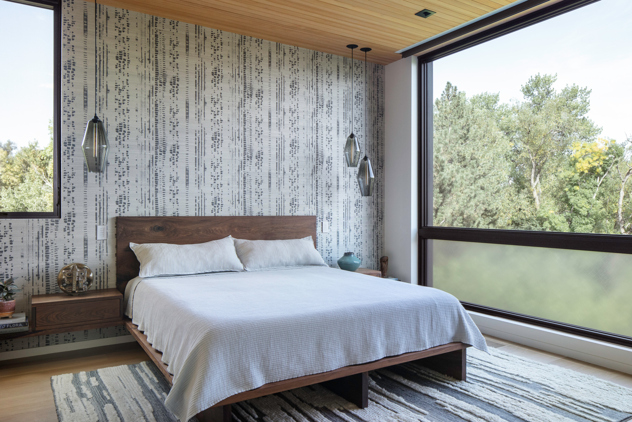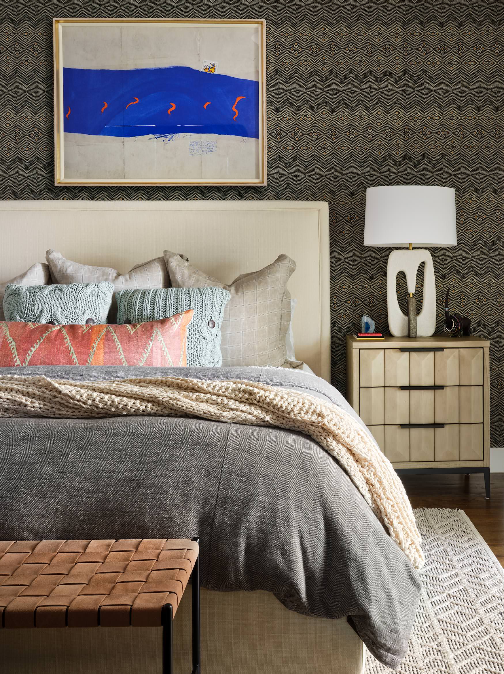 This Denver bedroom by Duet Design Group shows how a patterned wallpaper creates movement, depth and style.