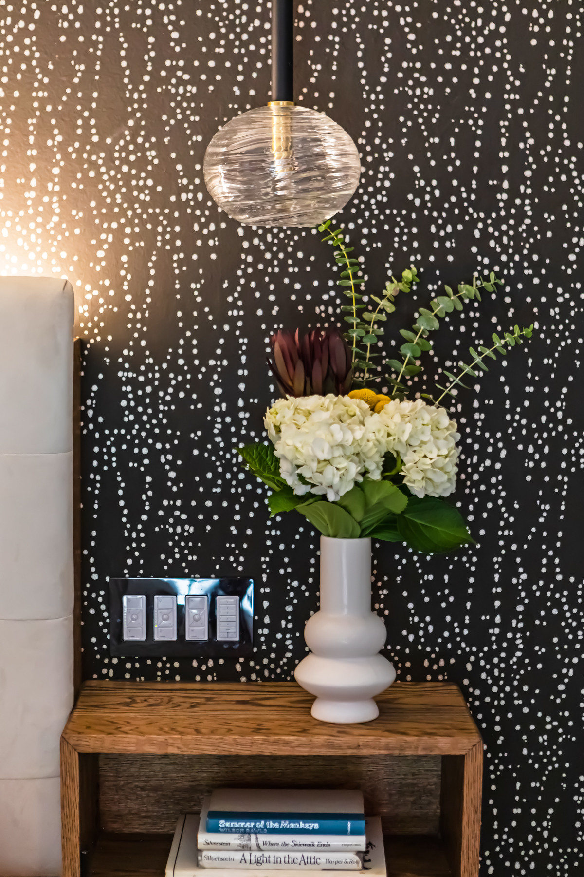 This Raleigh, North Carolina, bedroom by LK Design NC features a multifunction light switch panel discreetly disguised amid a similarly colored wallpaper.