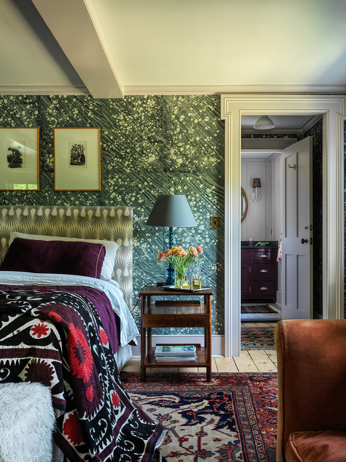 This Bridgeport, Connecticut, bedroom by Hendricks Churchill features energetic layers of pattern, color and artistic flair.