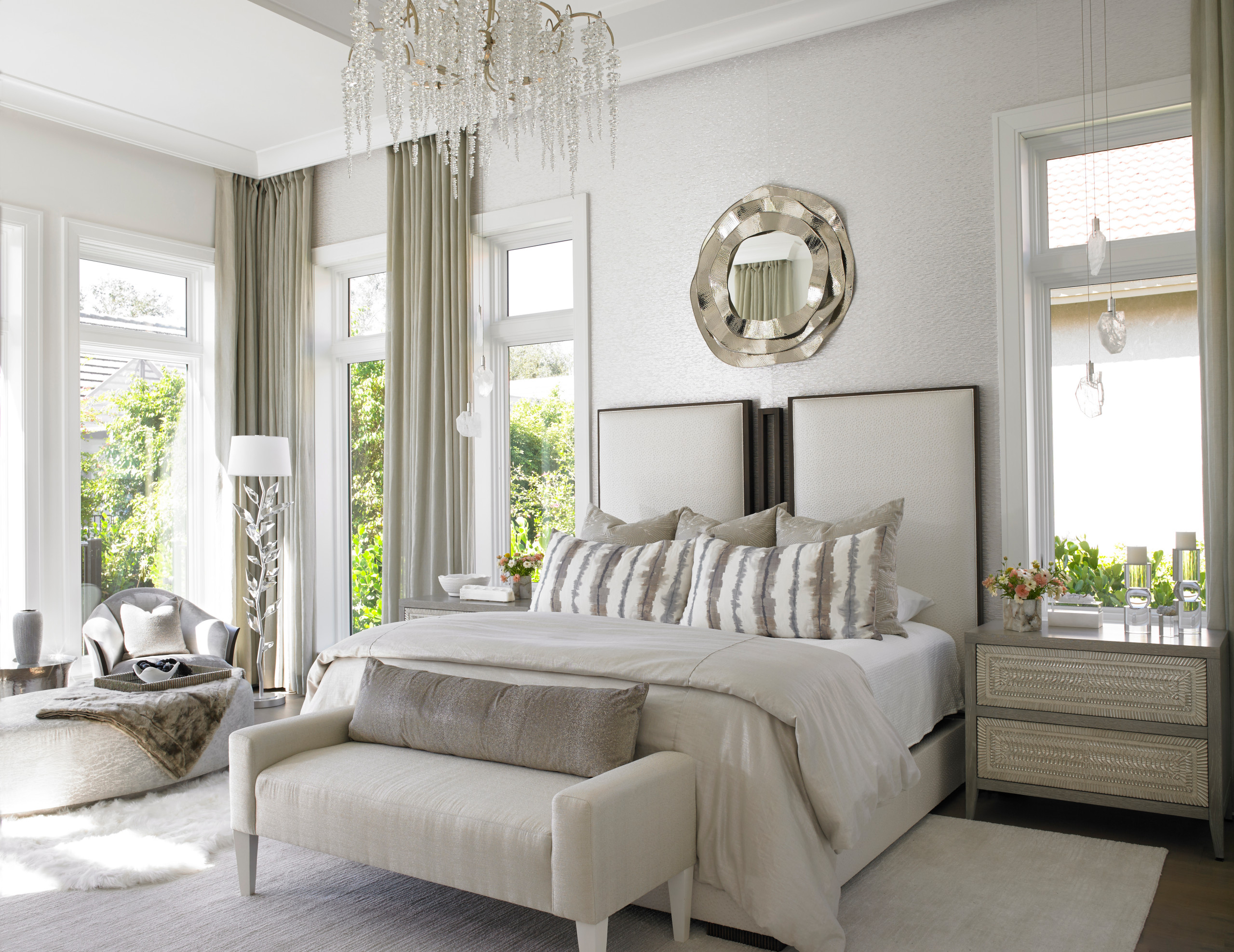 This inviting Tiburon, California, bedroom by Lane McNab Interiors features a little of both. You’ll also notice other recommended elements, such as an upholstered headboard, layered bedding, wallpaper, a rug and motorized window treatments hidden in the ceiling.