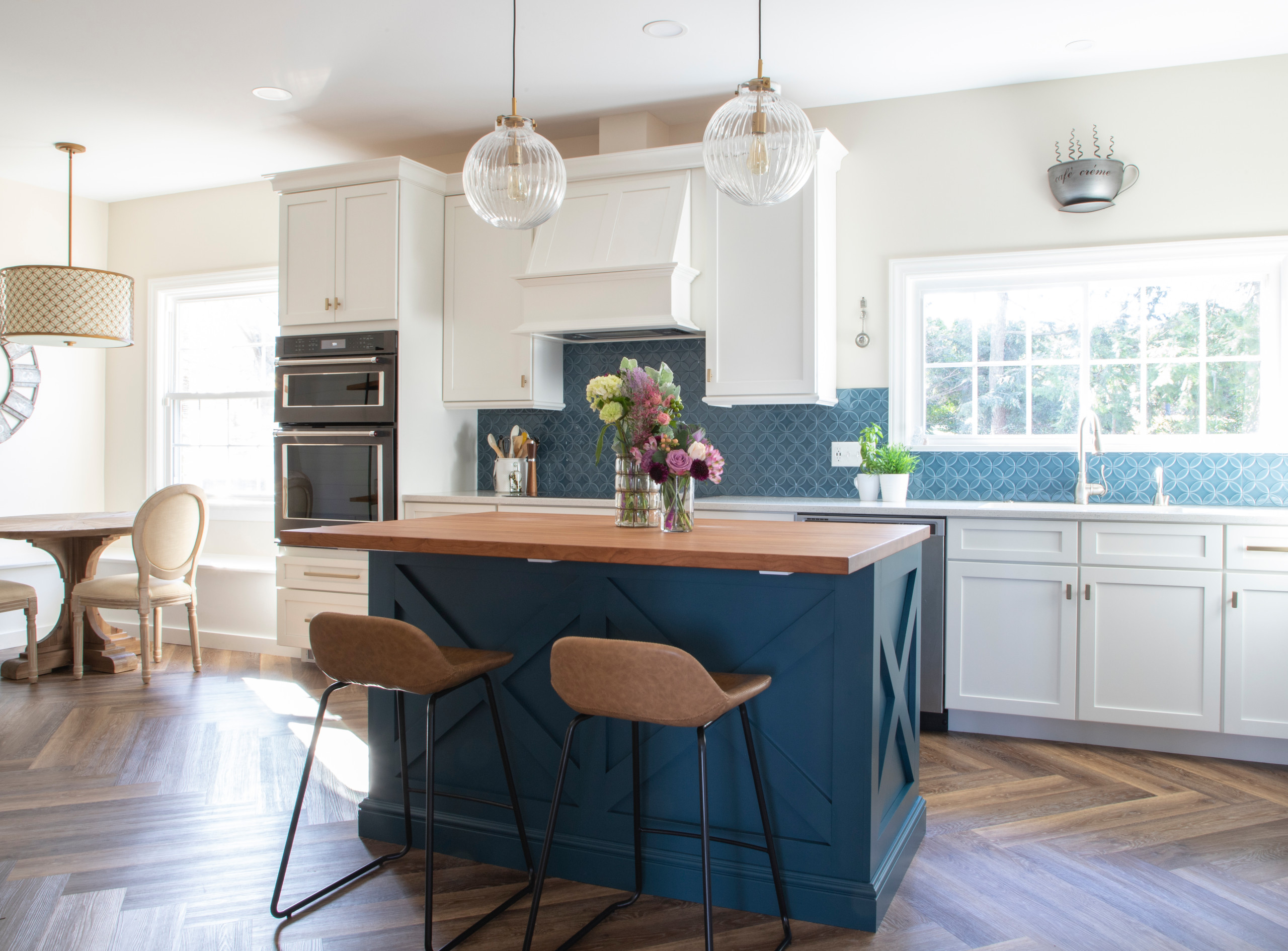 For this Pennsylvania kitchen, Kitchens by Eileen laid vinyl flooring in a herringbone pattern, boosting warmth and visual interest. Also notice the blue island and its wood countertop, which contrast the white perimeter cabinets and countertops. This kind of contrast is a popular trend, per the study.