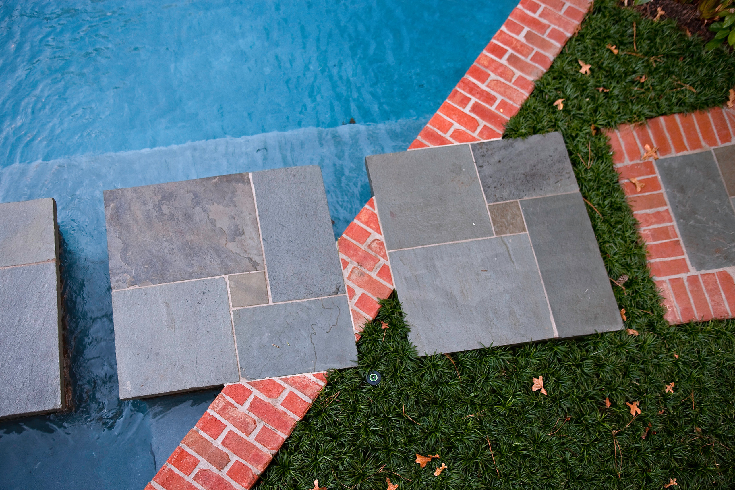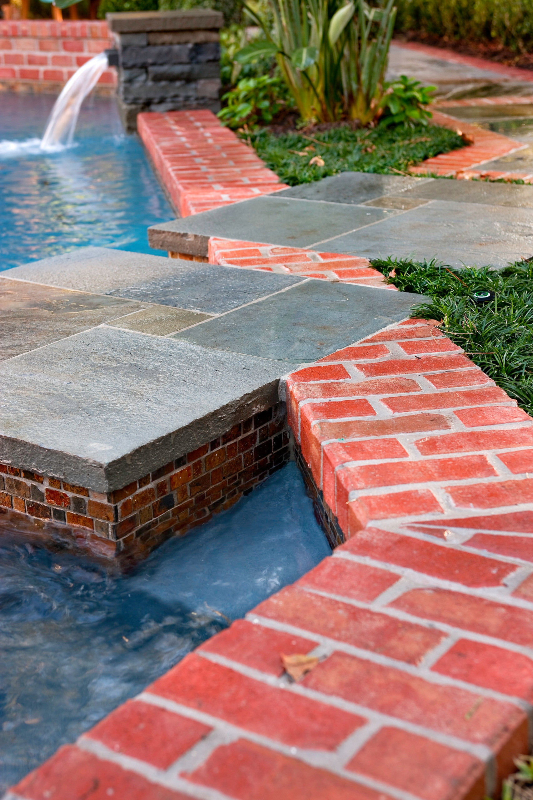 Natural stone pavers (resting on brick bases) appear to float as they cross the water, leading visitors to a walkway encircling the pool. The contrast of the stone and brick echoes that of the poolside patio design.