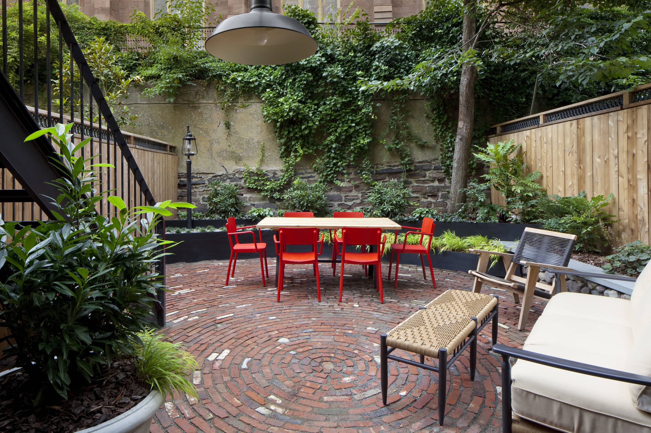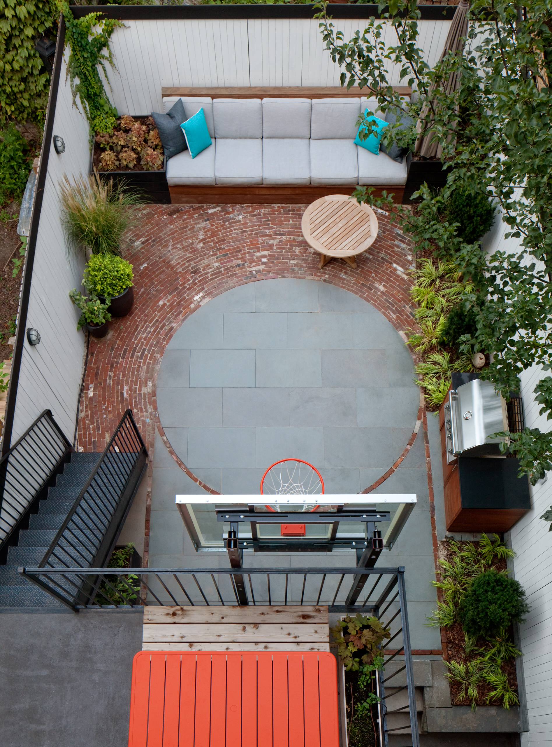 New Eco Landscapes also designed this other inspired brick patio in New York City, this time with backyard play in mind. The patio behind this home for a family of four combines brick and cut-stone pavers to suggest a basketball court that the two kids can use to practice their free throws.