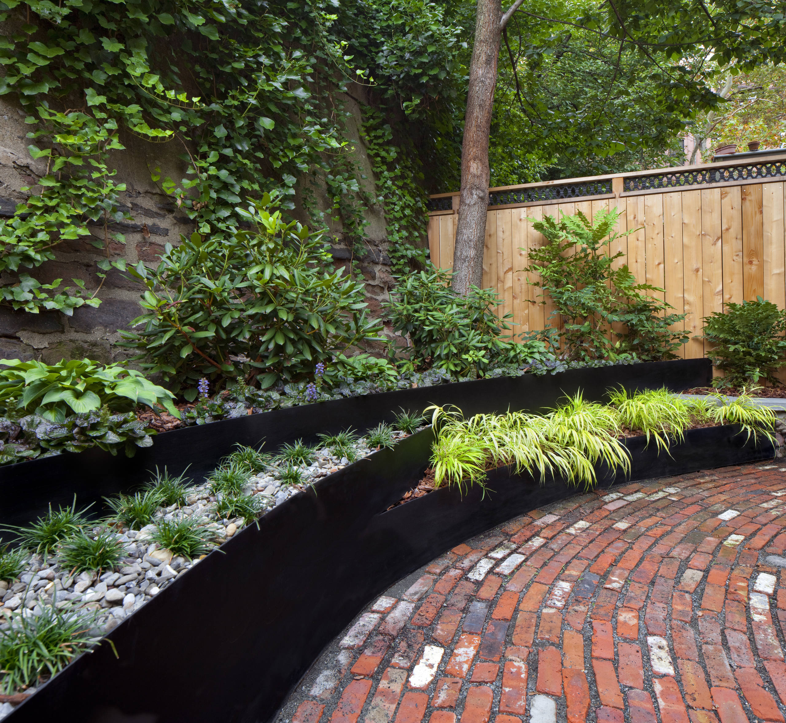 Looking down at this patio in New York City feels almost like looking into a spinning vortex or the spiral of a shell. Bricks arranged in concentric circles blend with the organic curves of metal-edged planting beds to create an eye-catching and unexpected design.