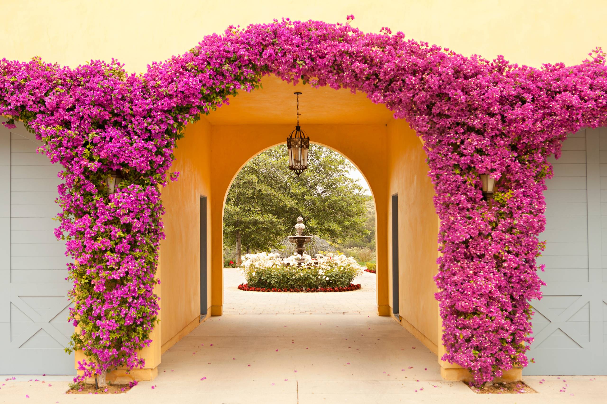 Bougainvillea’s vibrant colors herald the arrival of spring, adding a dramatic statement to the landscape. Interestingly, the color comes from bracts that surround tiny cream flowers.