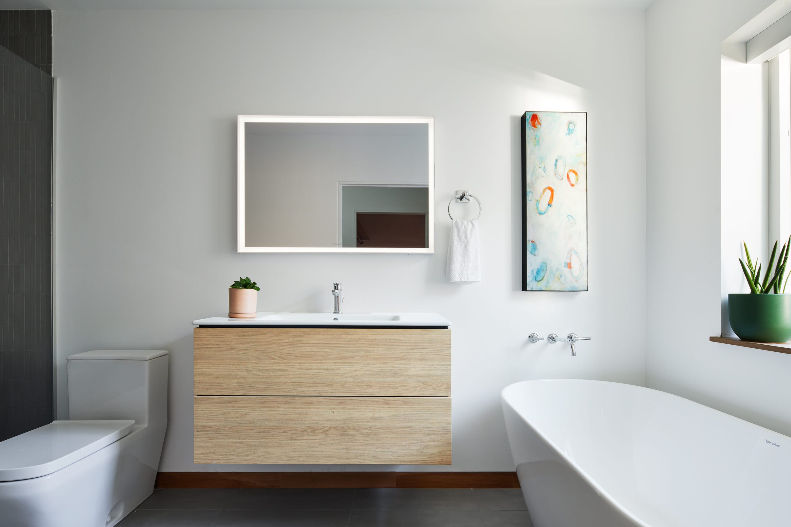 As for where to place it, aim for your new artwork — or your cluster of artwork — to occupy about two-thirds of the space above a feature like a tub or toilet.