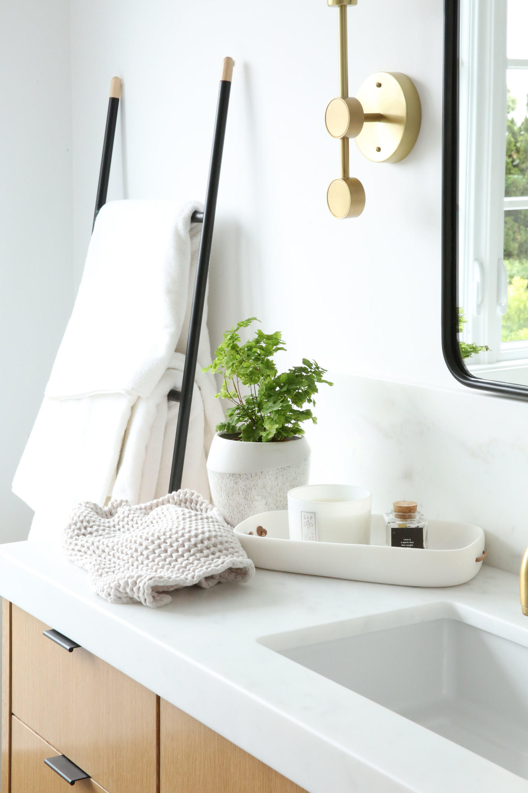 Grouping items on trays makes the items looks more intentional, plus you can simply lift the tray to clean underneath. So consider decanting anything else you must have on your counter, such as cotton balls and swabs or tissues, into pretty canisters and corralling them on a tray. A flower, plant or even a sprig of eucalyptus is a fresh finishing touch.