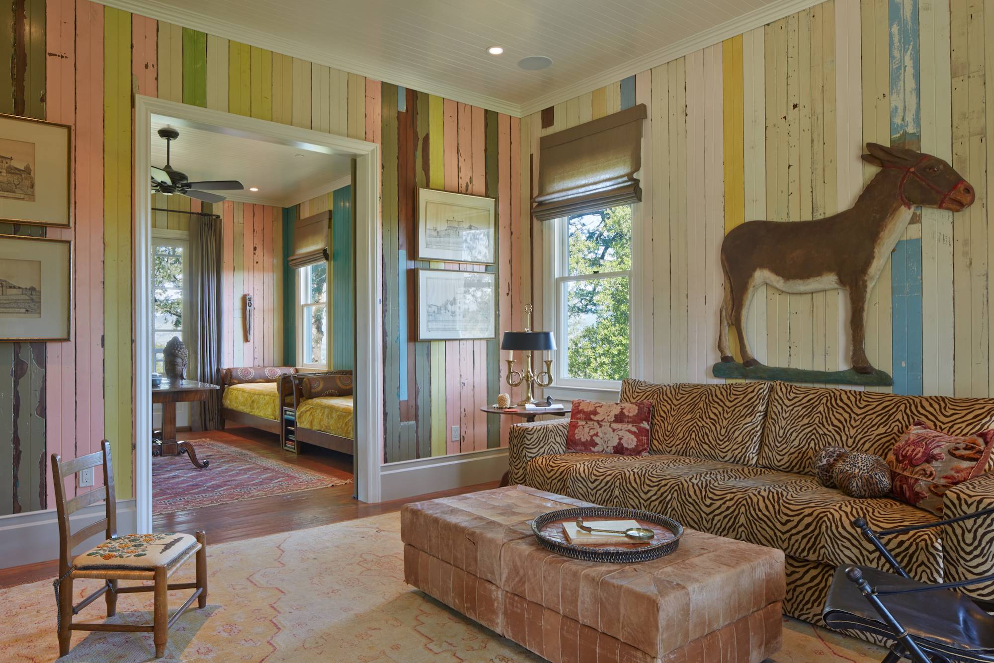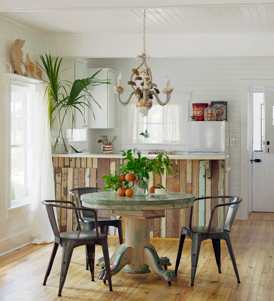 8. Make the boards stand out by surrounding them with white. In this beach house, interior designer and historic preservationist Jane Coslick used reclaimed boards from the home’s original walls on the kitchen bar. She highlighted the unique feature by painting the rest of the ceilings and walls crisp, clean white. The colors in the reclaimed wood also play off the weathered patina of the table and the more subtle colors in the seashell chandelier.