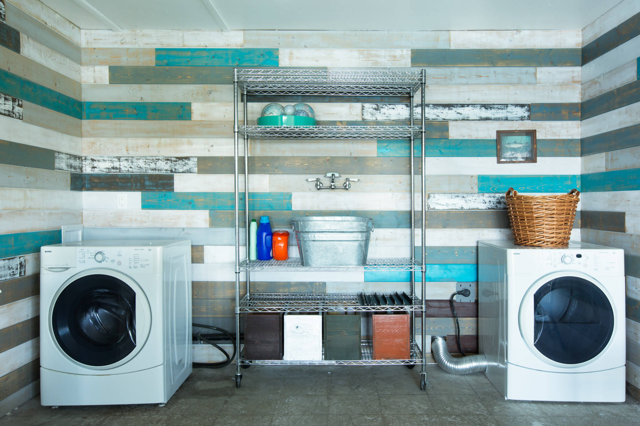 4. Plan the composition beforehand. For this laundry room on Mayne Island in British Columbia, the boards were inspired by reclaimed lumber walls but are new. However, the paint could be considered “reclaimed.” Artist Ian McLeod used what he called “the dregs” of all the paint cans left over from other home projects to give the new boards a reclaimed look. He carefully planned the composition, and his partner, Kerry Johnson, meticulously installed them according to his layout.