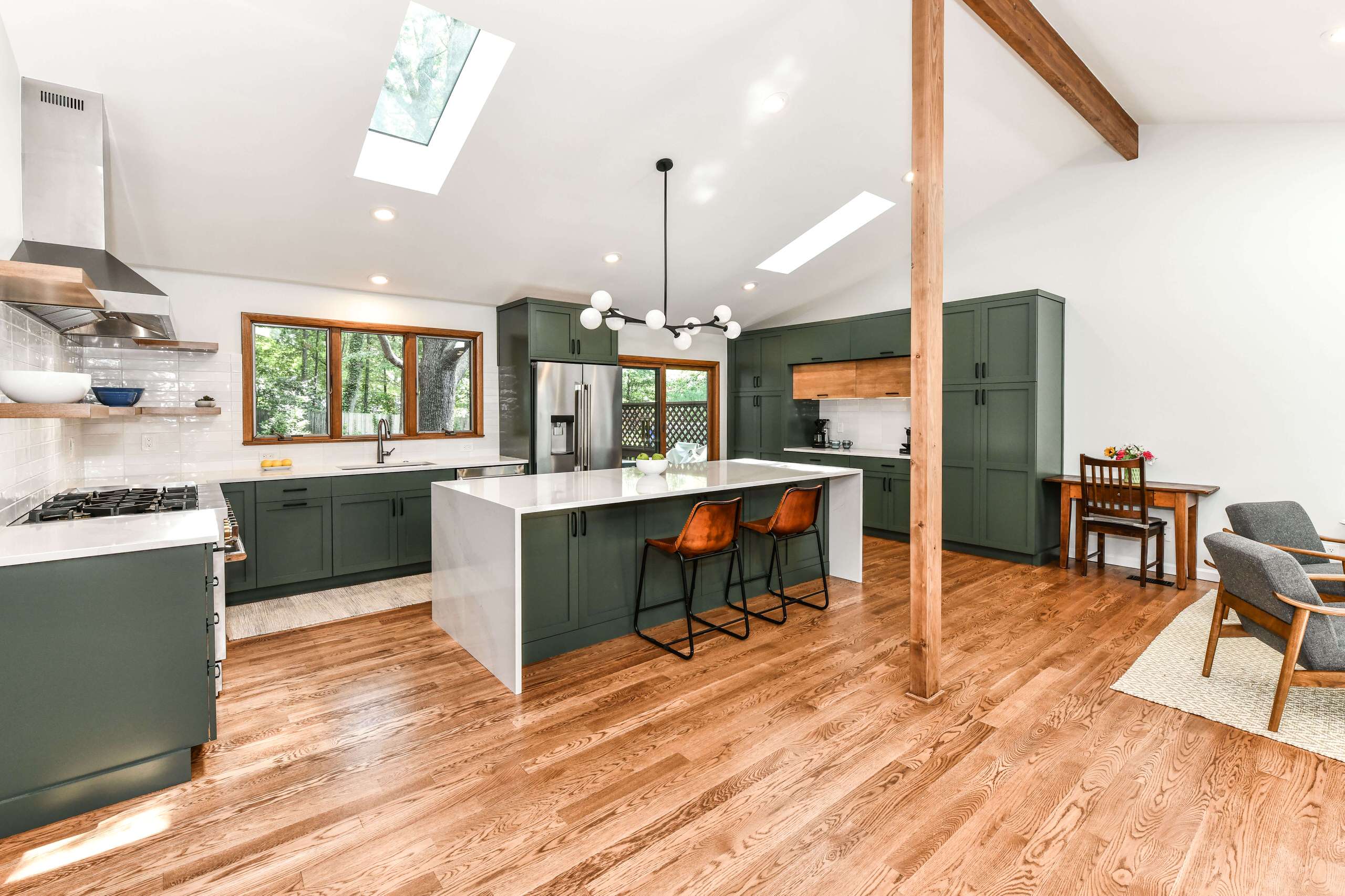 An open layout with deep green perimeter cabinets (Mountain Pass by Sherwin-Williams), a custom natural white oak island and white oak flooring updates this classic Iowa kitchen by design firm Morris Lare. Marble-look quartz countertops, a white ceramic tile backsplash and white appliances keep things from feeling heavy.