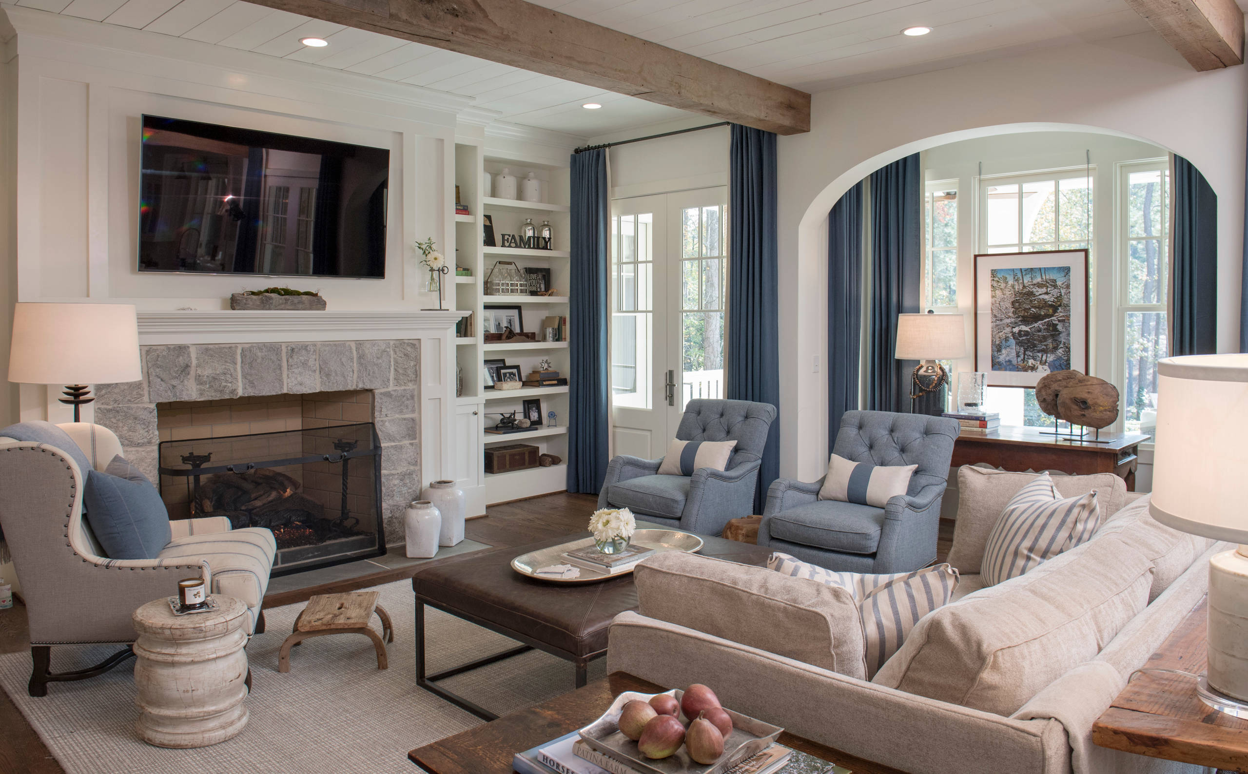 This Atlanta living room by Tom Williams Residential also adopted the more-is-more approach. A love seat and three upholstered chairs handle daily needs, while a leather coffee table and side stool serve as additional seating as needed.