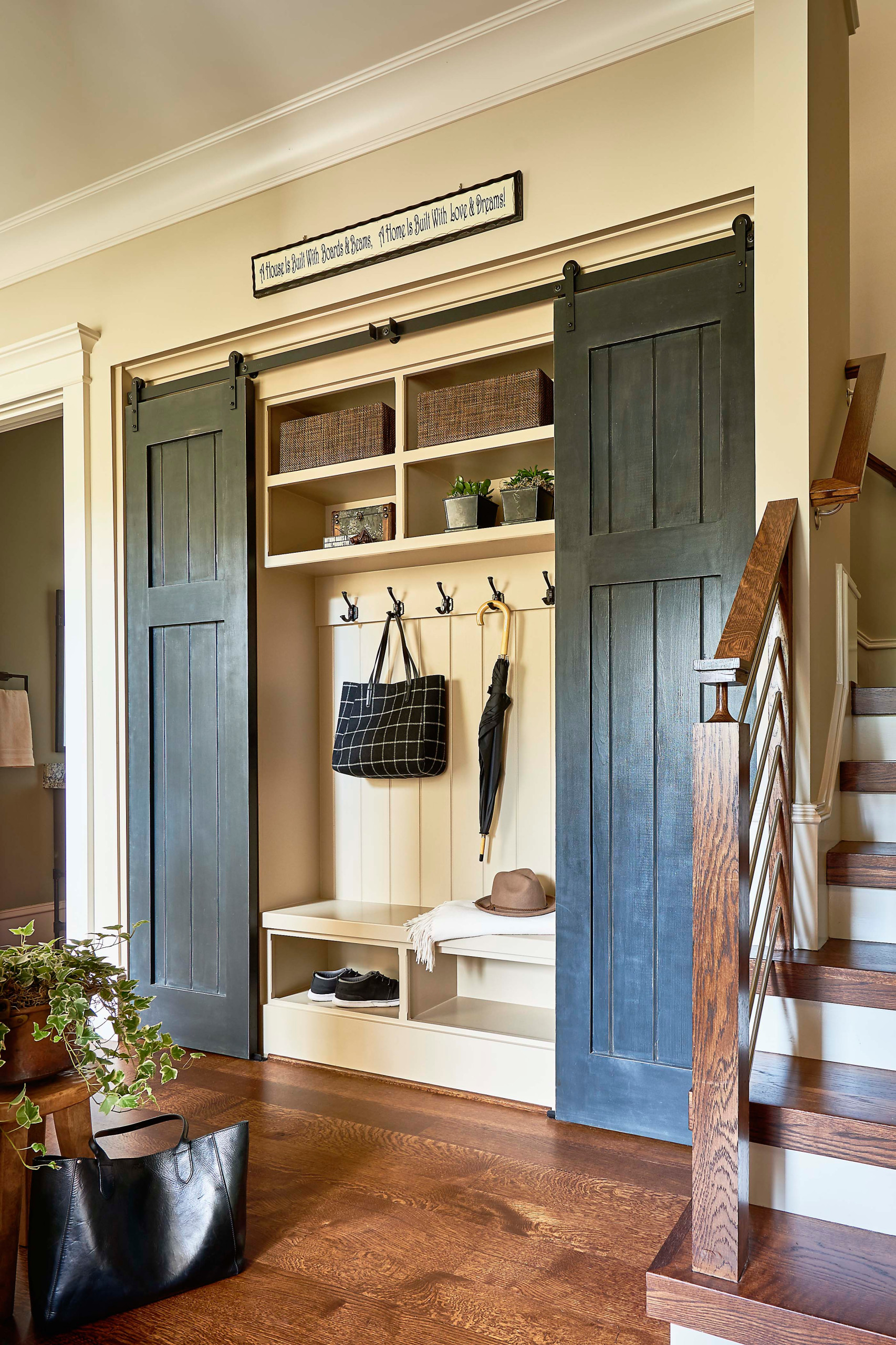 You can also go the custom route with dedicated built-in storage and seating, as Rufty Custom Built Homes and Remodeling did for this entryway, also in Raleigh. Barn-style doors can close off the area to further keep clutter at bay. The photo earned the company a Best of Houzz Design award.