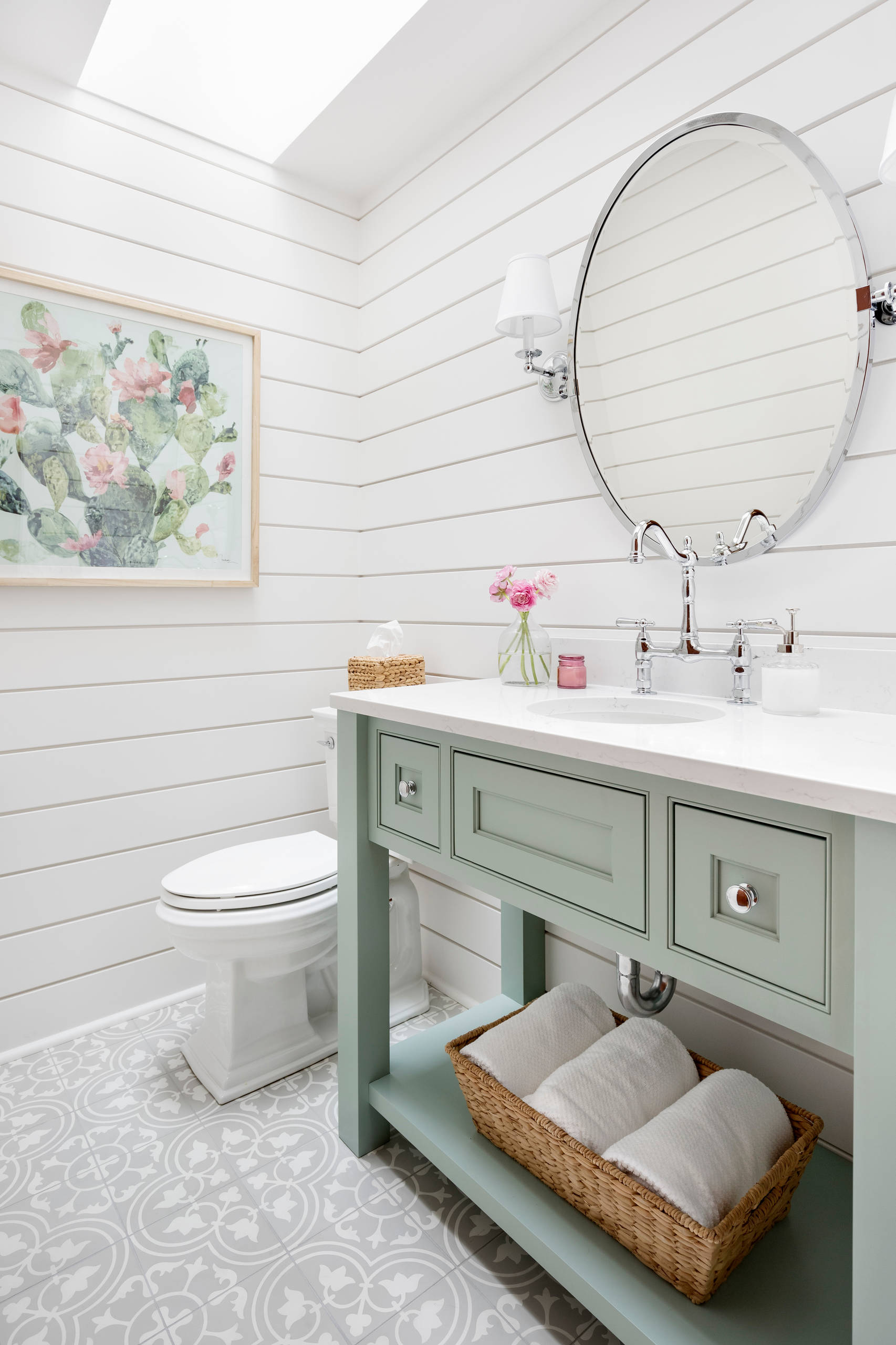 In this popular powder room, designer Kimberlee Gorsline of Kimberlee Marie Interior Design wrapped all the walls in white shiplap to create a textured backdrop for a mint green vanity and patterned ceramic floor tile.