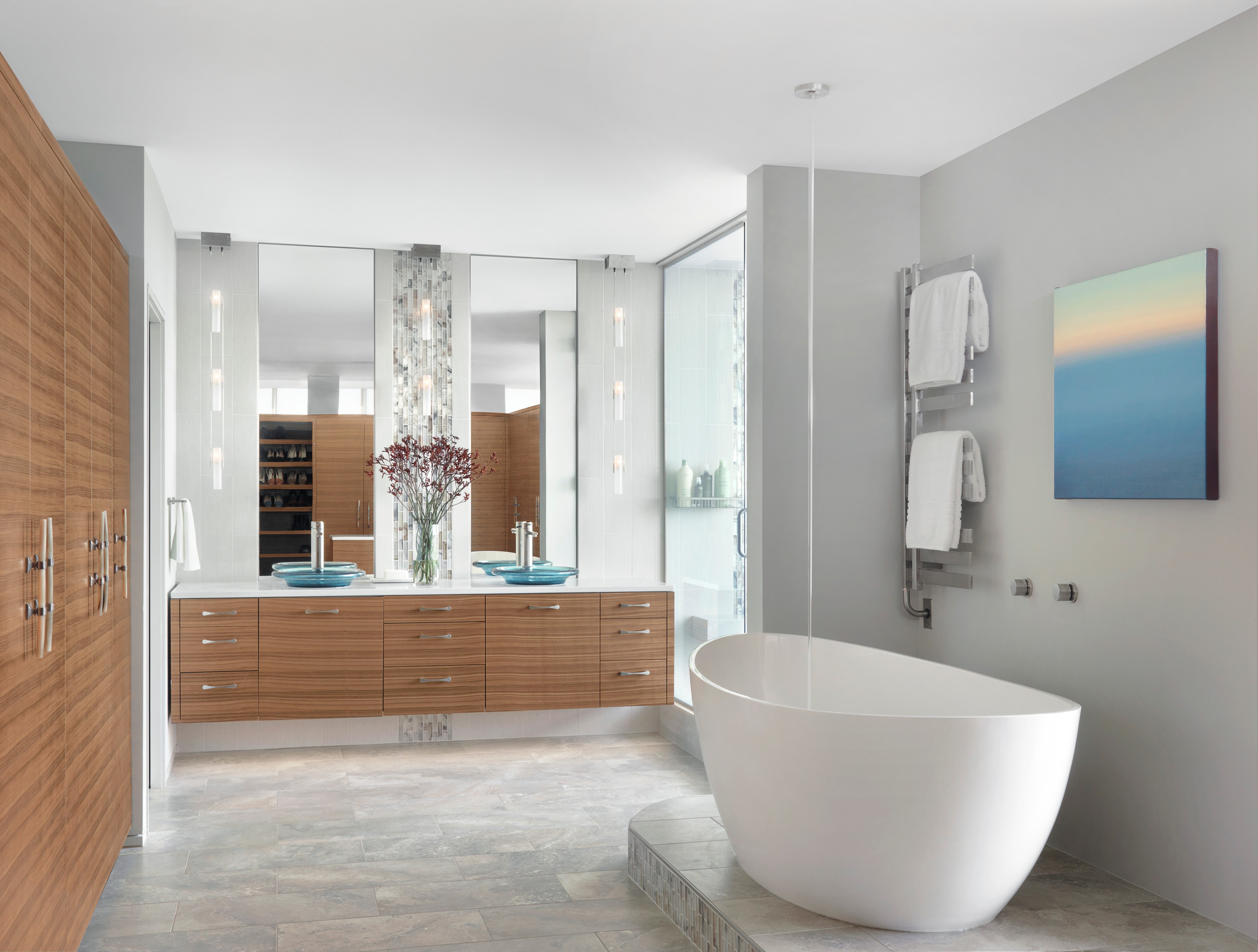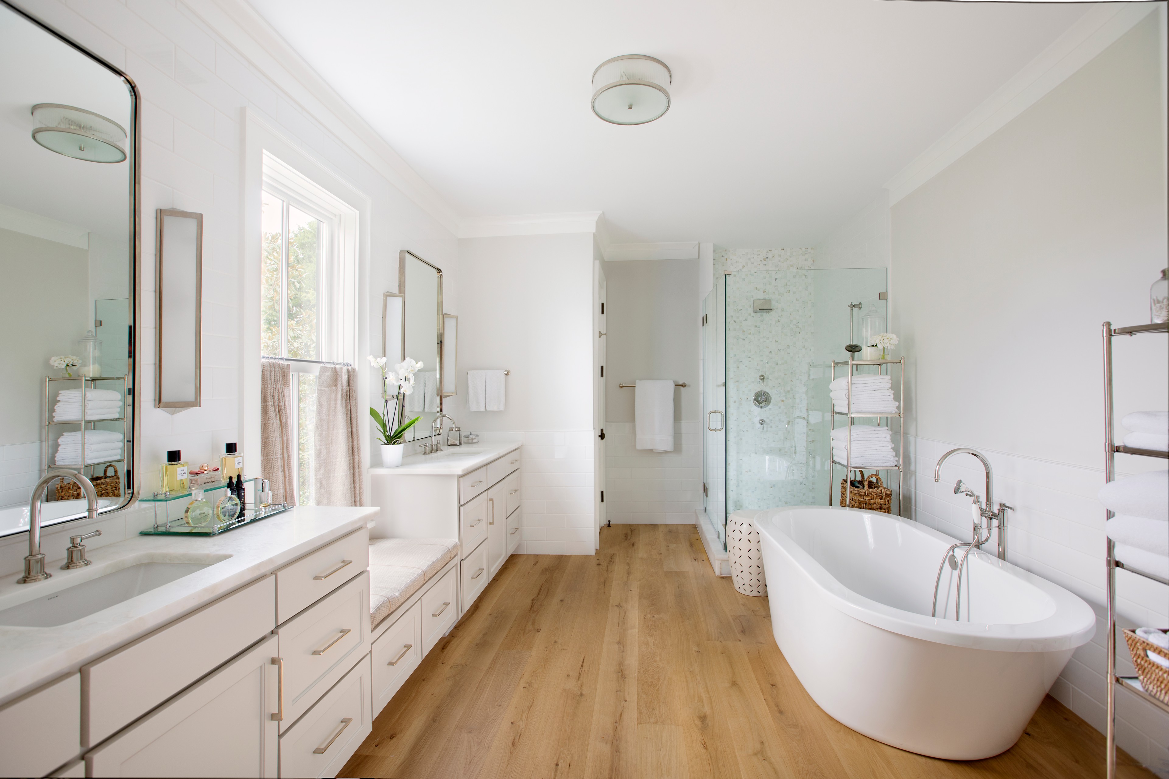 Here, a cushioned bench connecting two vanities offers a place where someone can chill out while the tub is filling.