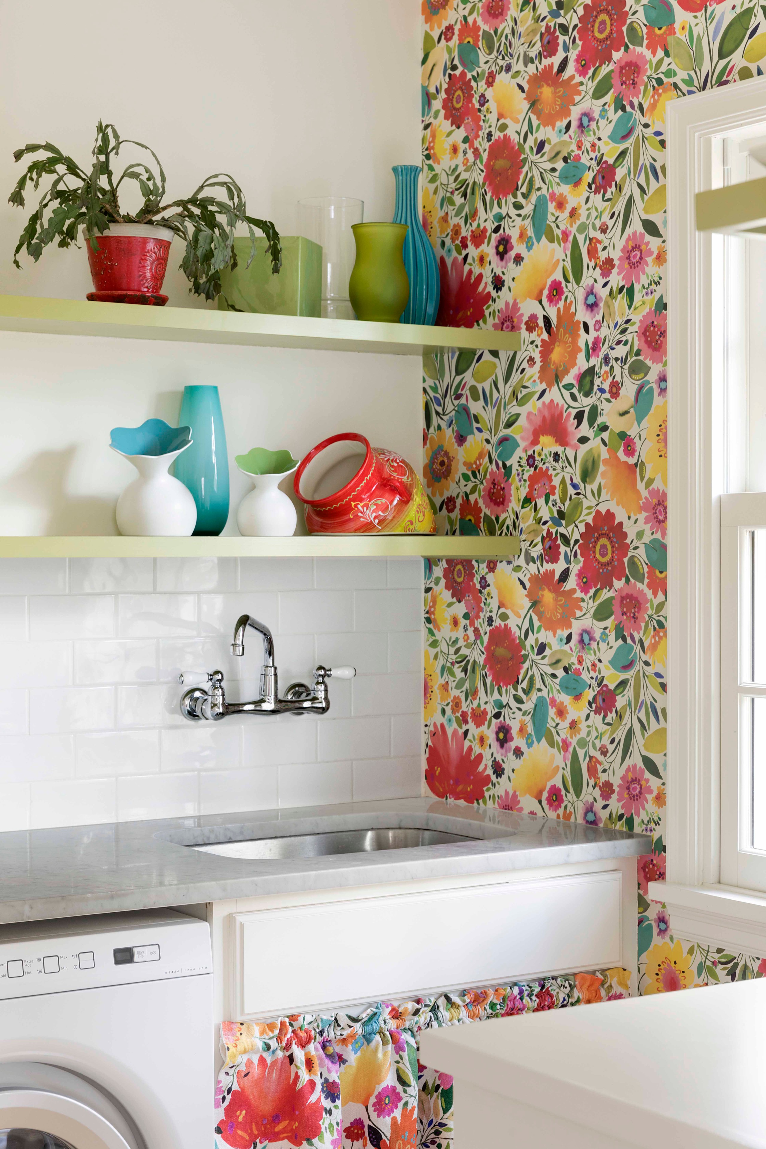 Bright floral wallpaper and a coordinating sink skirt join colorful pottery to jazz up this Minnesota laundry room by Acacia Architects.