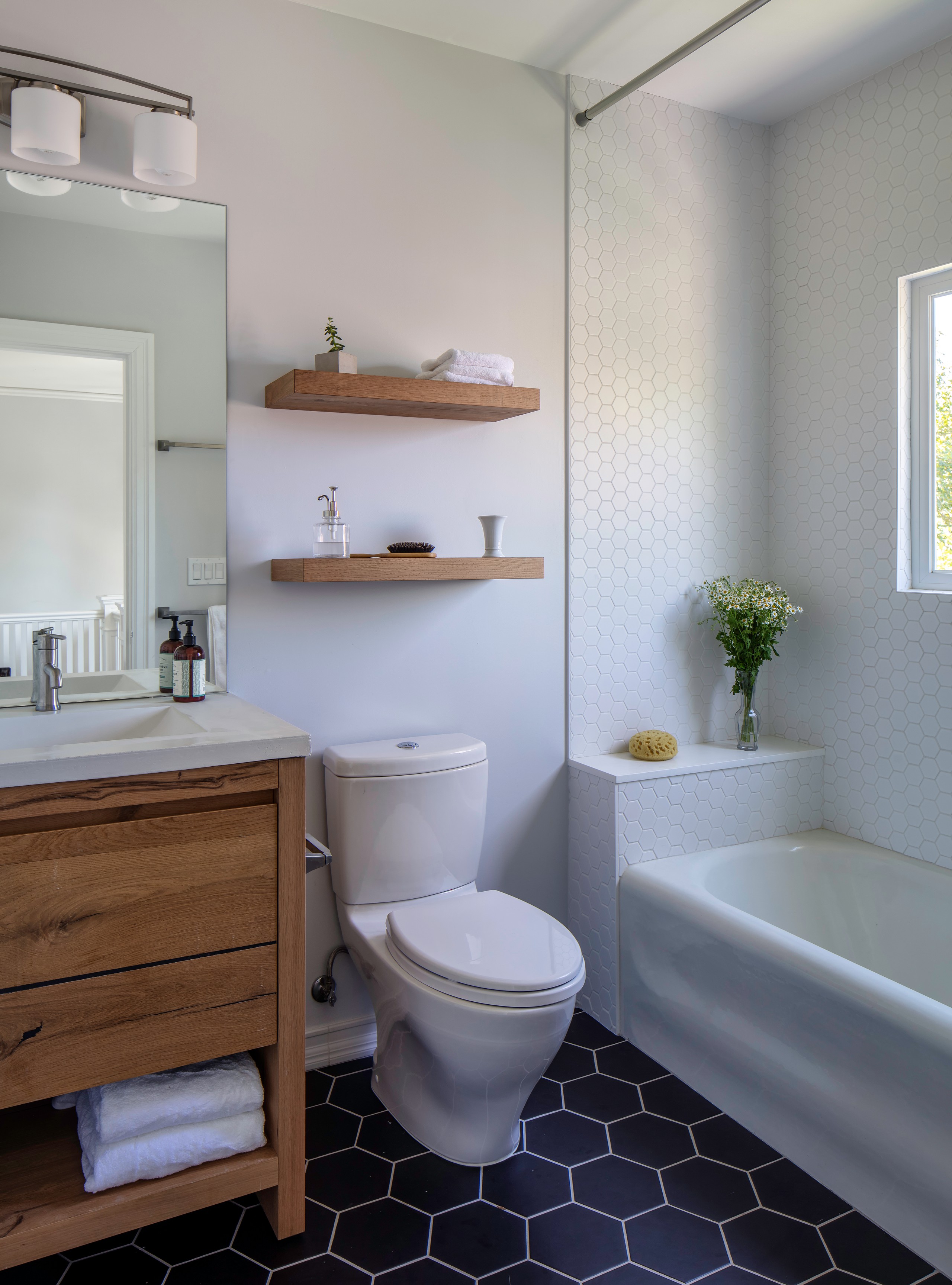 Tile isn’t the only option. Designer Clara Jung of Banner Day Interiors applied a custom wood apron to help make this small bathroom stand out.