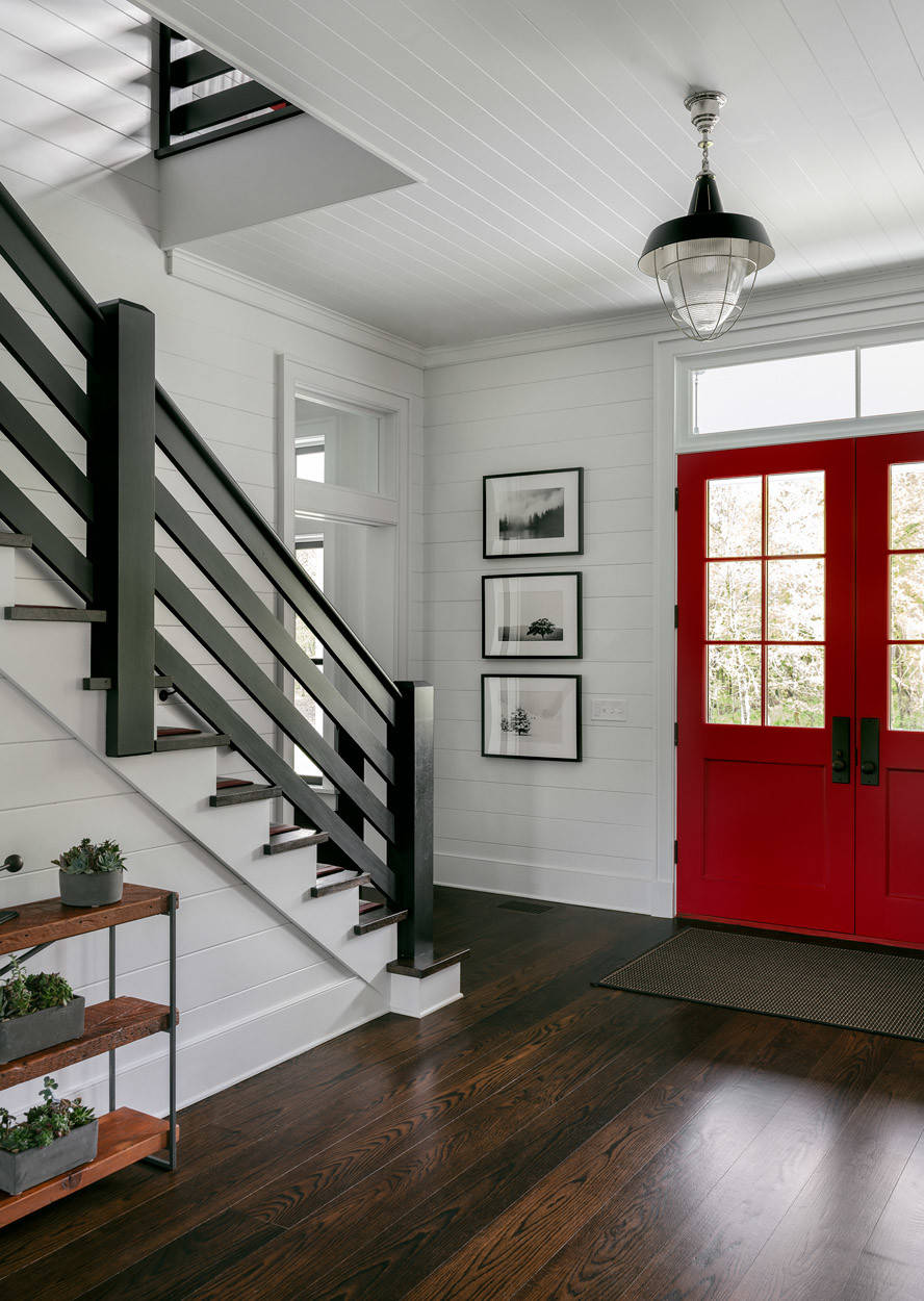 A door painted in Heritage Red by Benjamin Moore gives this New York farmhouse entry a dash of energy.
