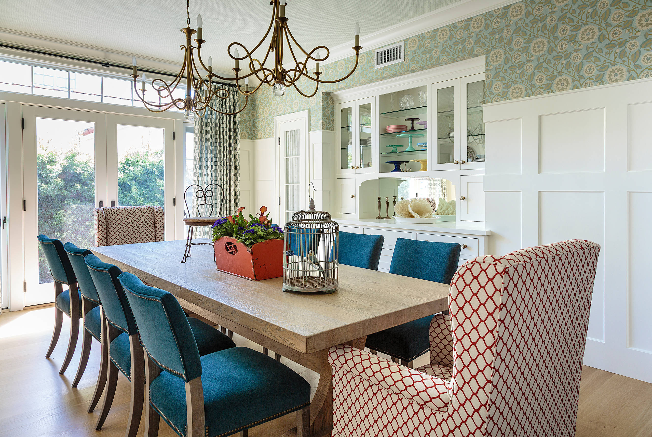 In the same home as the laundry room by Alison Kandler Interior Design in number seven above, the dining room has a similar caffeinated vibe with blues, greens and coral-reds. There’s even a small-scale-pattern wallpaper on the ceiling.