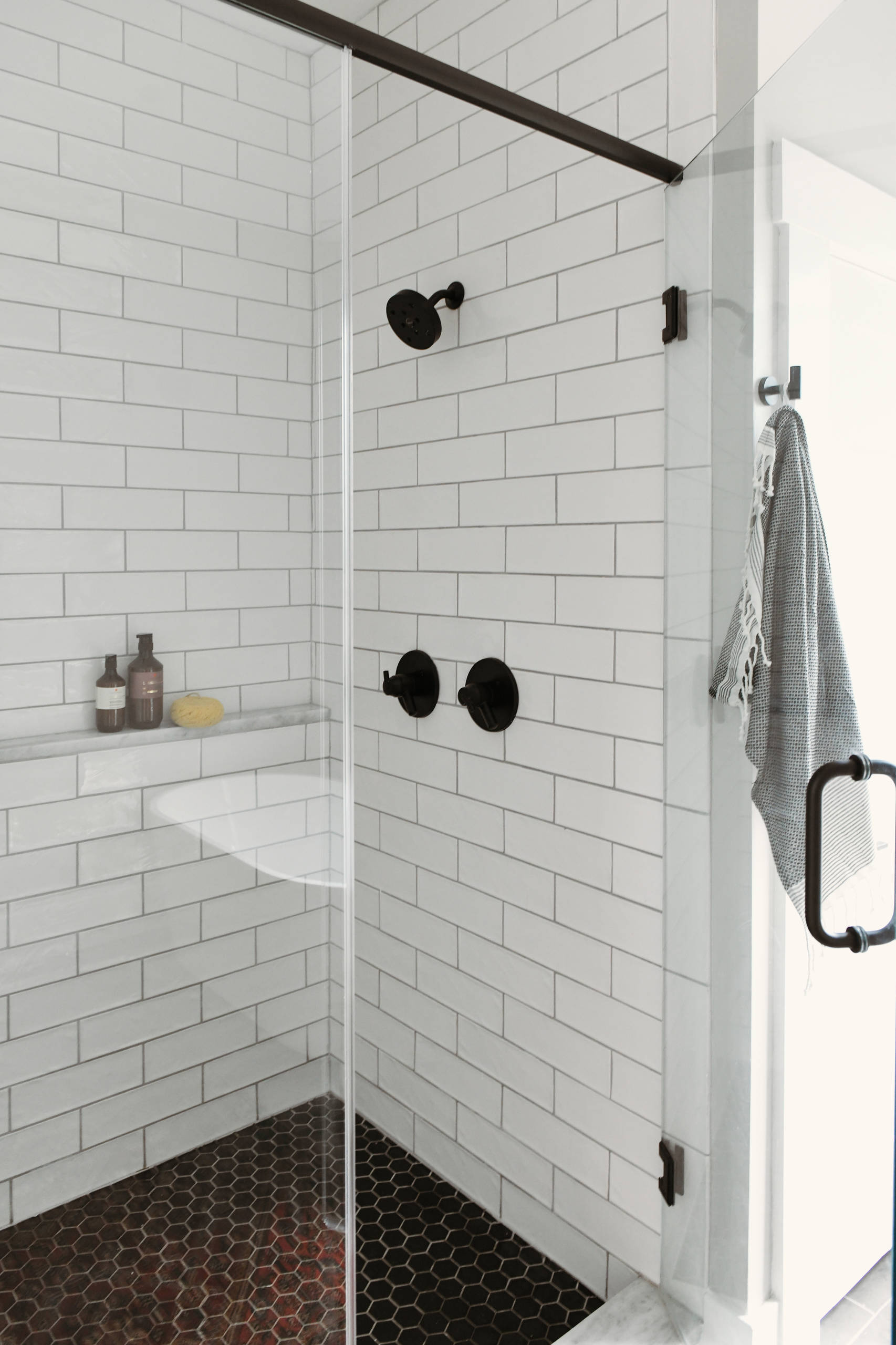 Here, white beveled subway tile on the walls and tub apron help create a cohesive design while adding a bit of shimmer and texture.