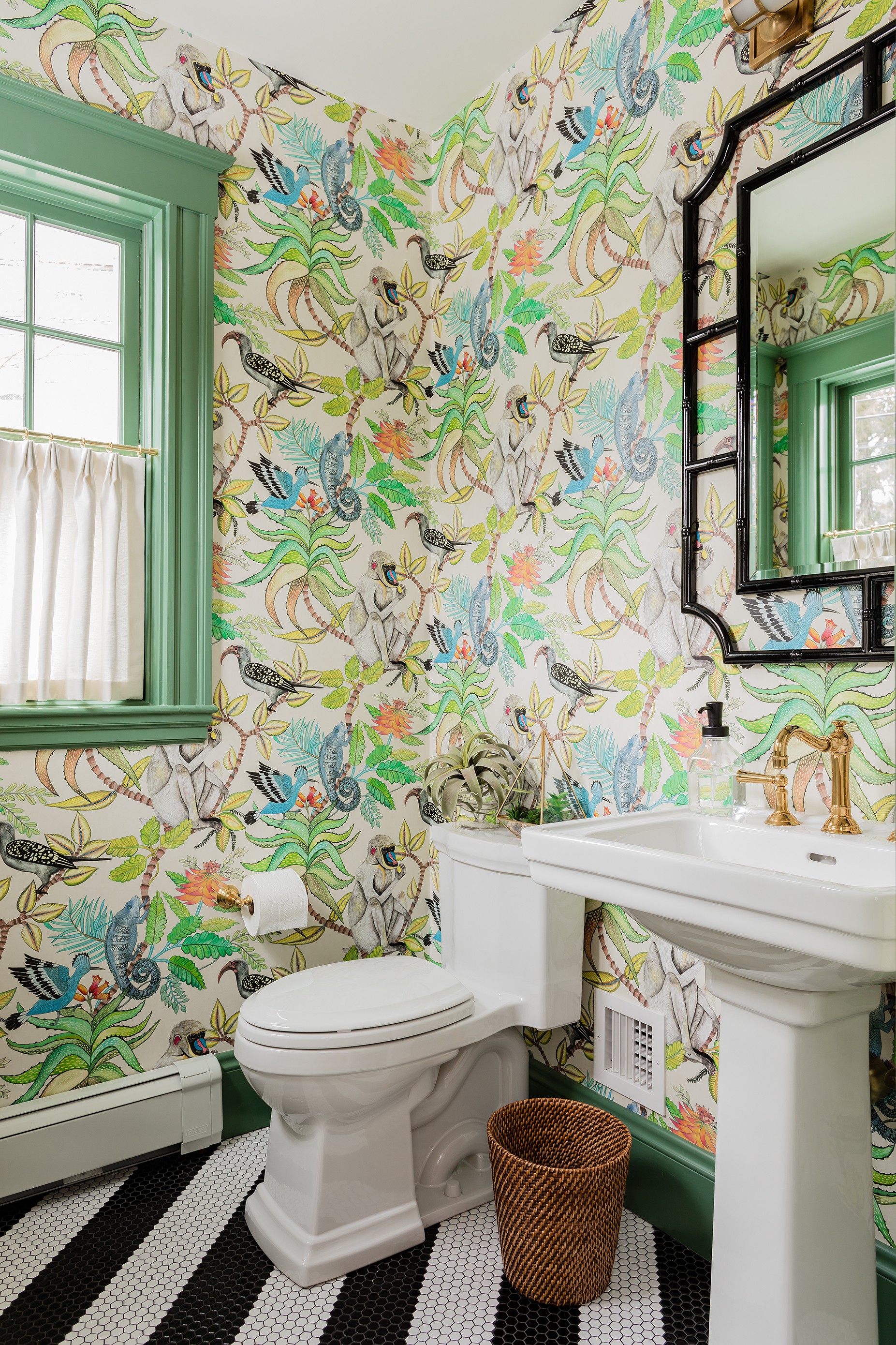 Designer Kelly Rogers got funkier with a jungle-theme wallpaper in this Boston powder room.