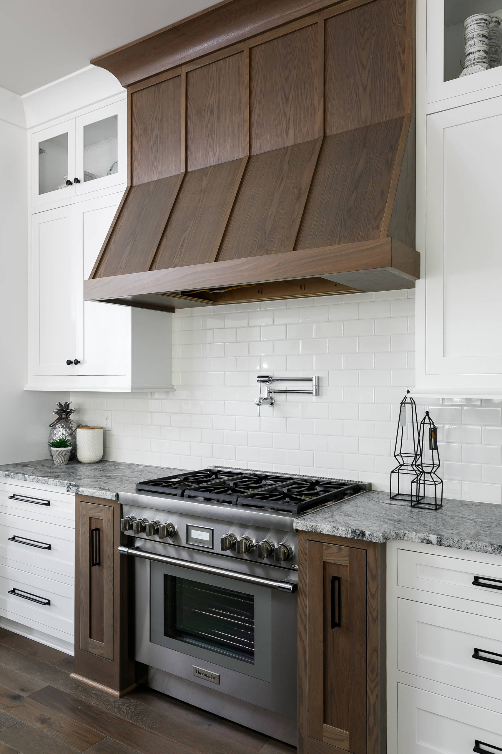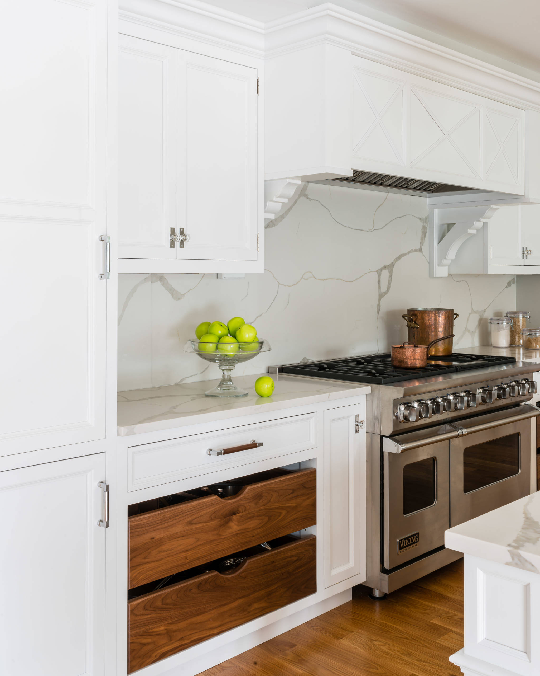 Here, vertical wood pullouts flanking the range help offset the white cabinets and complement the range hood.