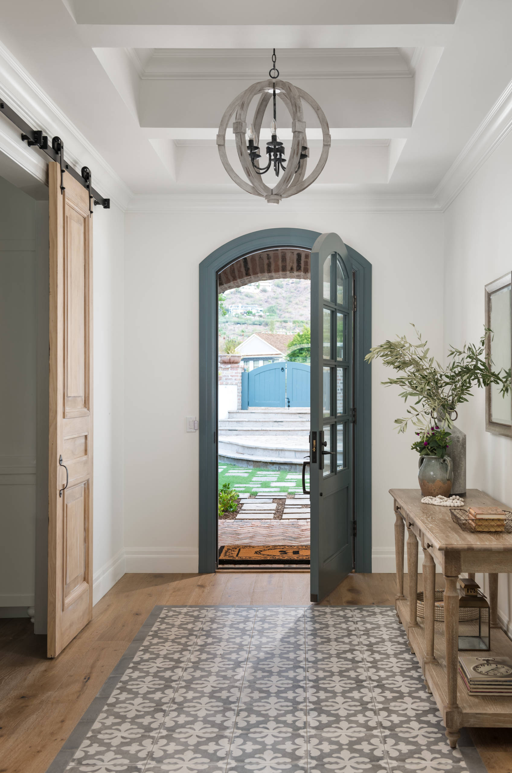 Here, a rich blue-green front door complements inset floor tile.