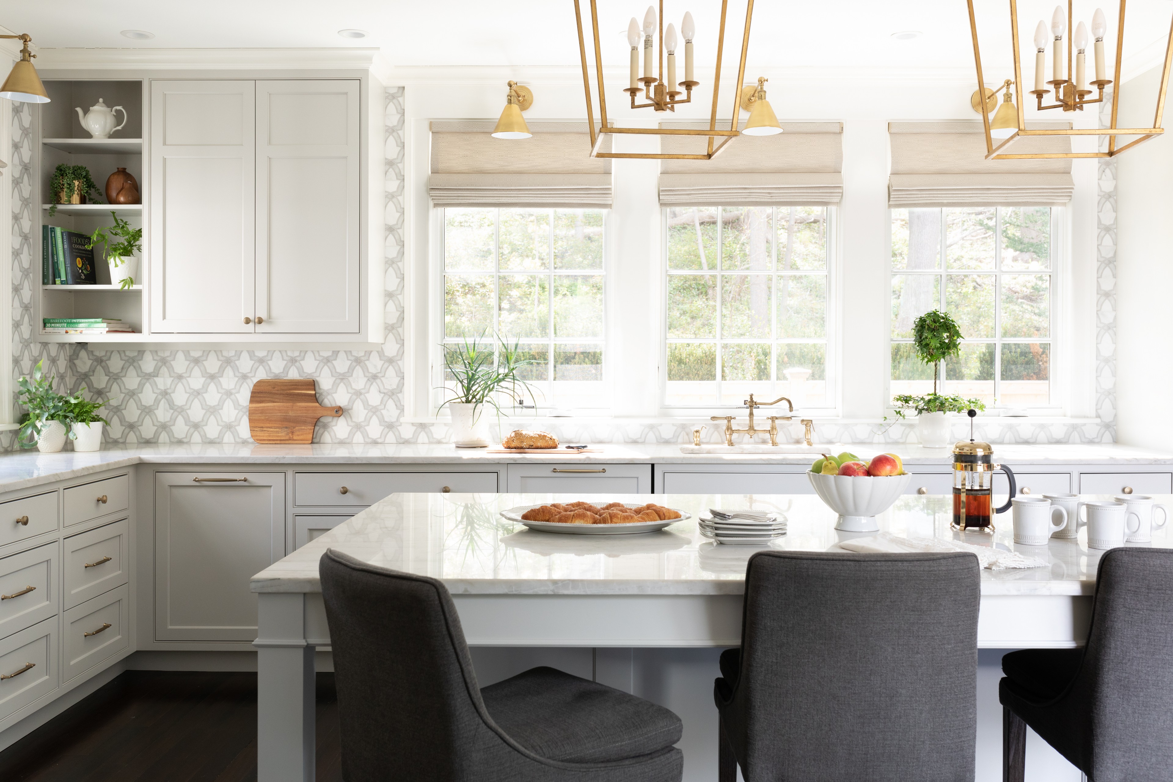 In this Boston kitchen by Windhill Builders, soft gray cabinets (Light Pewter by Benjamin Moore) join soft satin-brass fixtures and a light marble backsplash and quartzite countertops for a refreshing look.