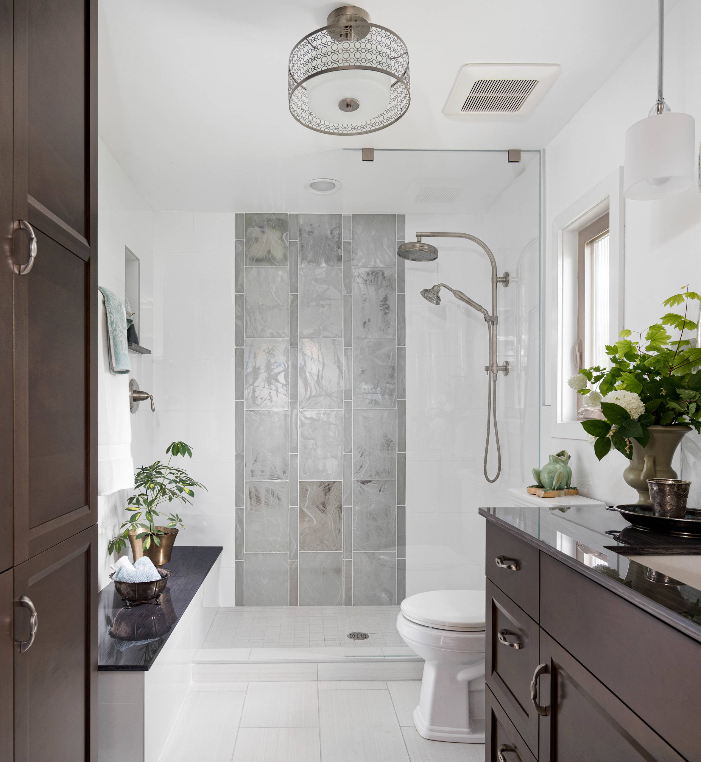 Designer Kristine Tyler of Treefrog Design recently remarked how nice it is to have a place in a bathroom for sitting that’s not the toilet. She designed a bench that runs from an armoire into the shower stall in the bathroom seen here, giving the homeowners a seat outside of the shower as well as in it.