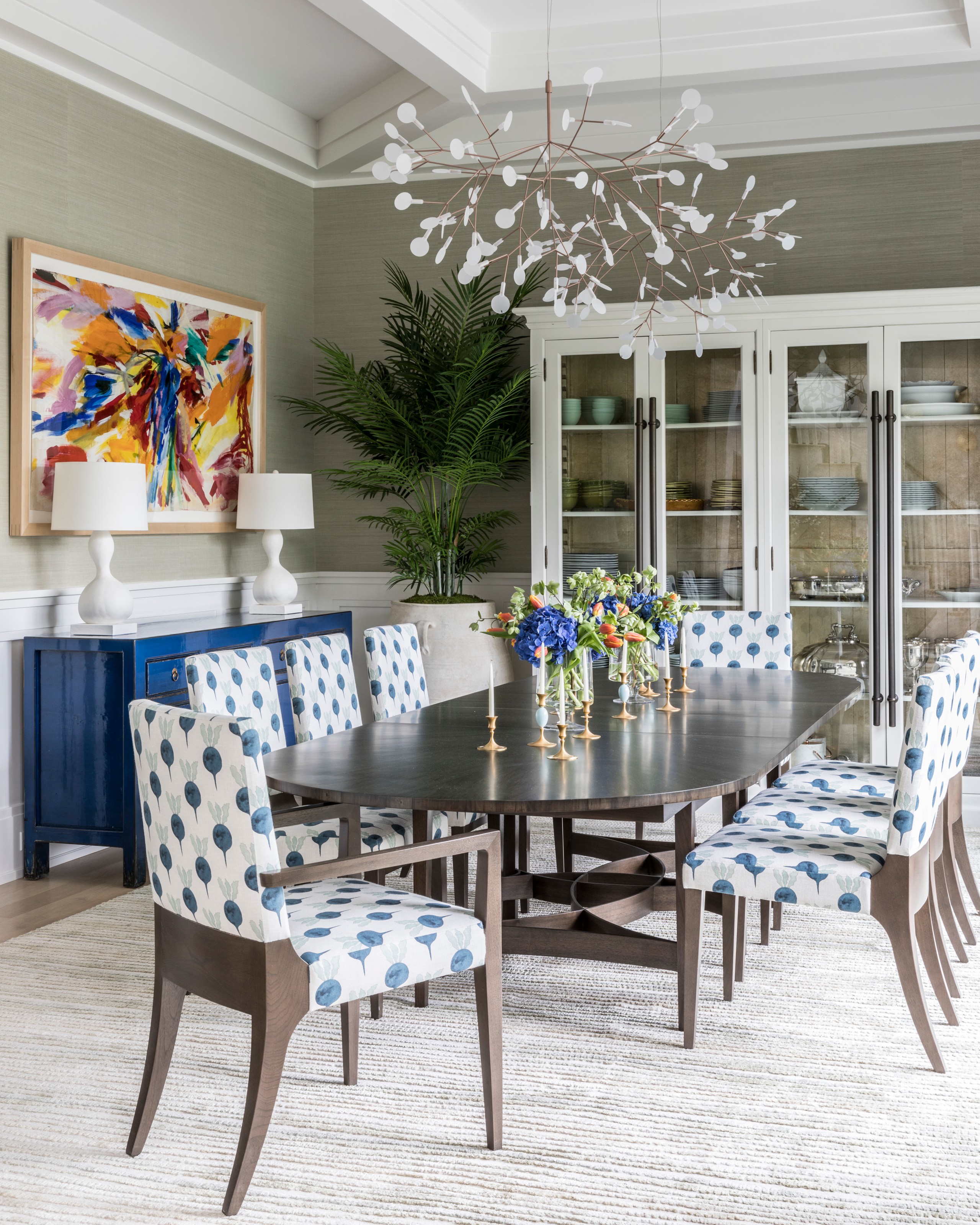 In this New York dining room by Bennett Leifer Interiors, grasscloth wallpaper is a textural backdrop for playfully patterned chairs, a glossy saturated blue buffet, vibrant artwork and a statement-making light fixture.