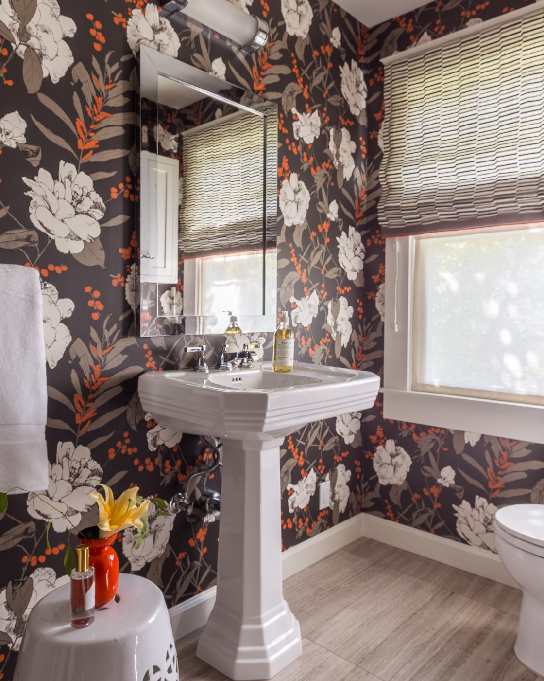 And designer Ann Lowengart created a moody yet inviting atmosphere with large-print floral wallpaper in this San Francisco powder room.