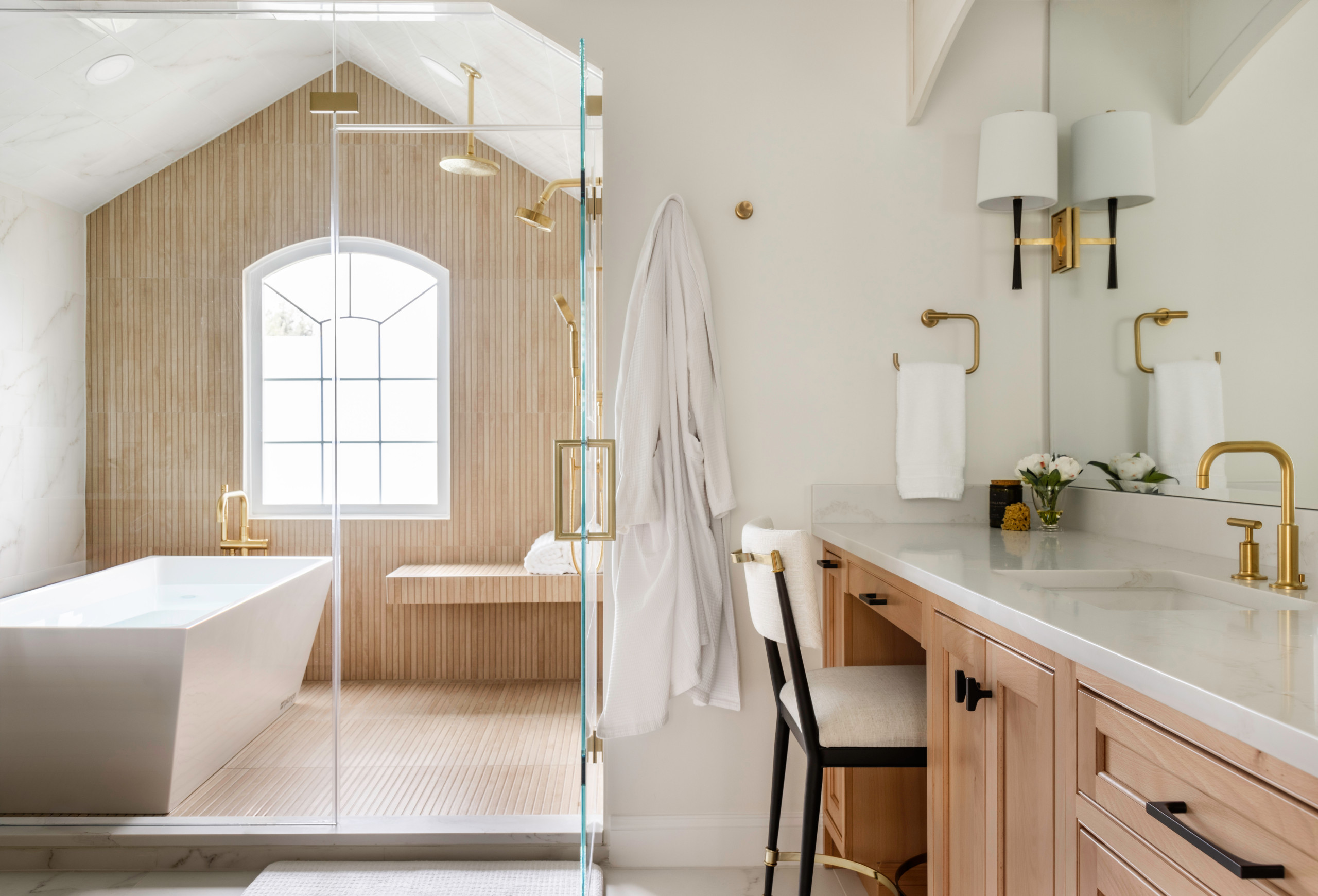 A wet room with a large soaking tub and a calming white-and-wood palette gives this Washington, D.C., bathroom by SK Interiors a spa-like feel.