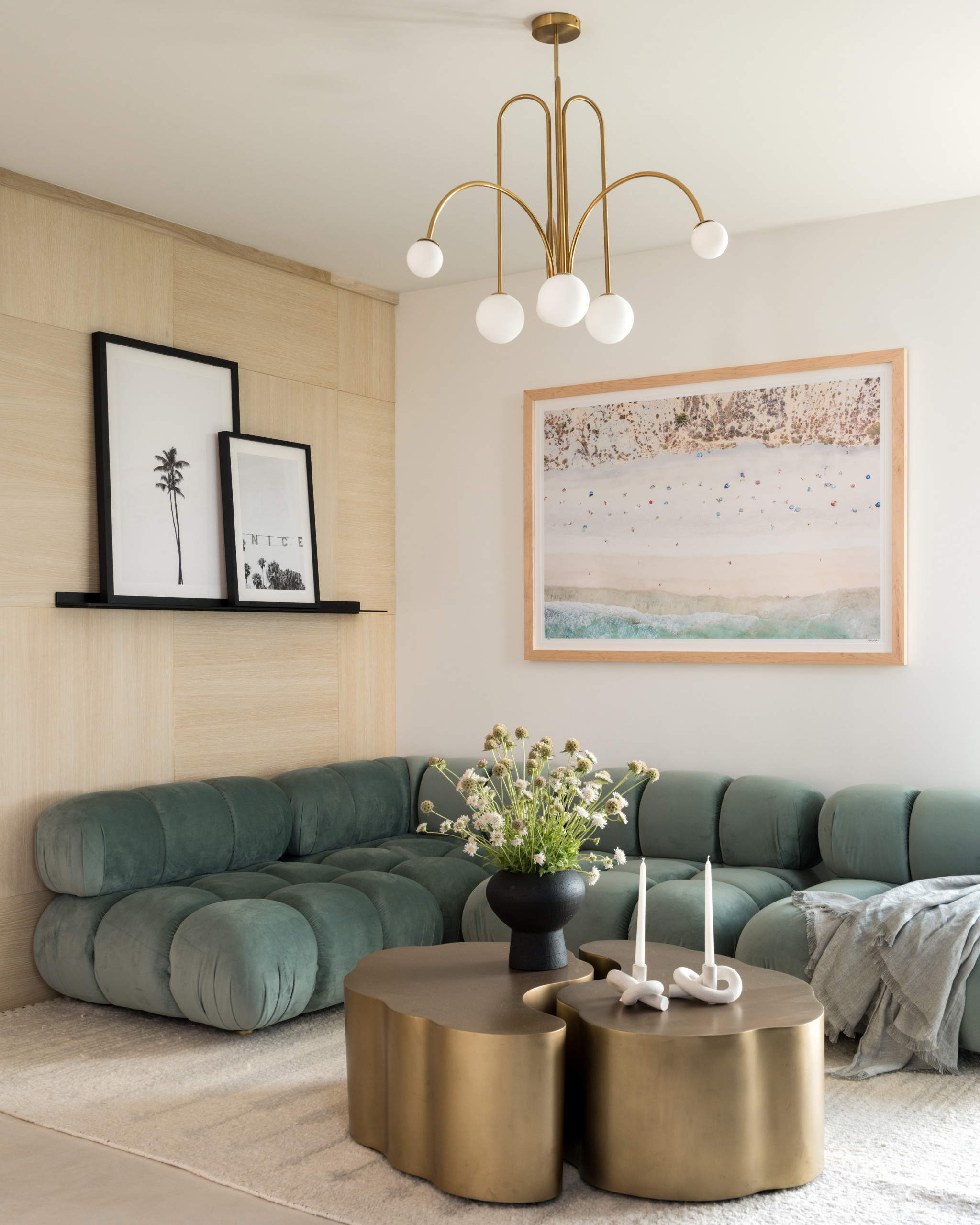 In this San Diego living room by Erin Anderson Interiors, a bulbous sectional sofa and sculptural brass coffee tables and light fixture create a softened, inviting look.