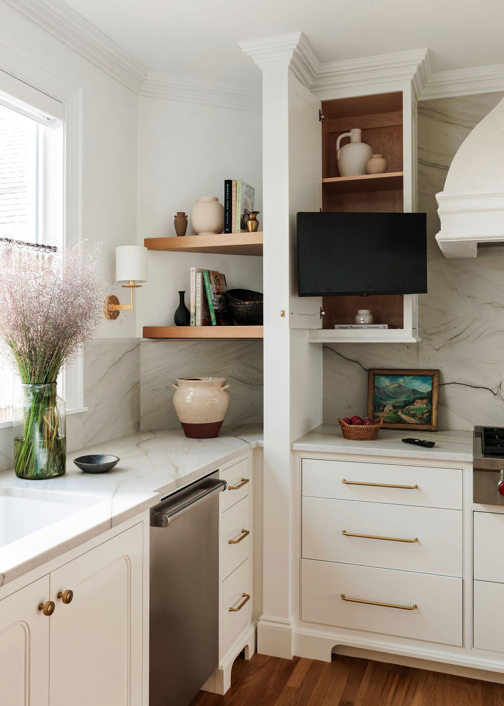 In another Greensboro kitchen, Legg and Foley added a cabinet with a TV mounted on a swing arm that can be hidden when not in use.