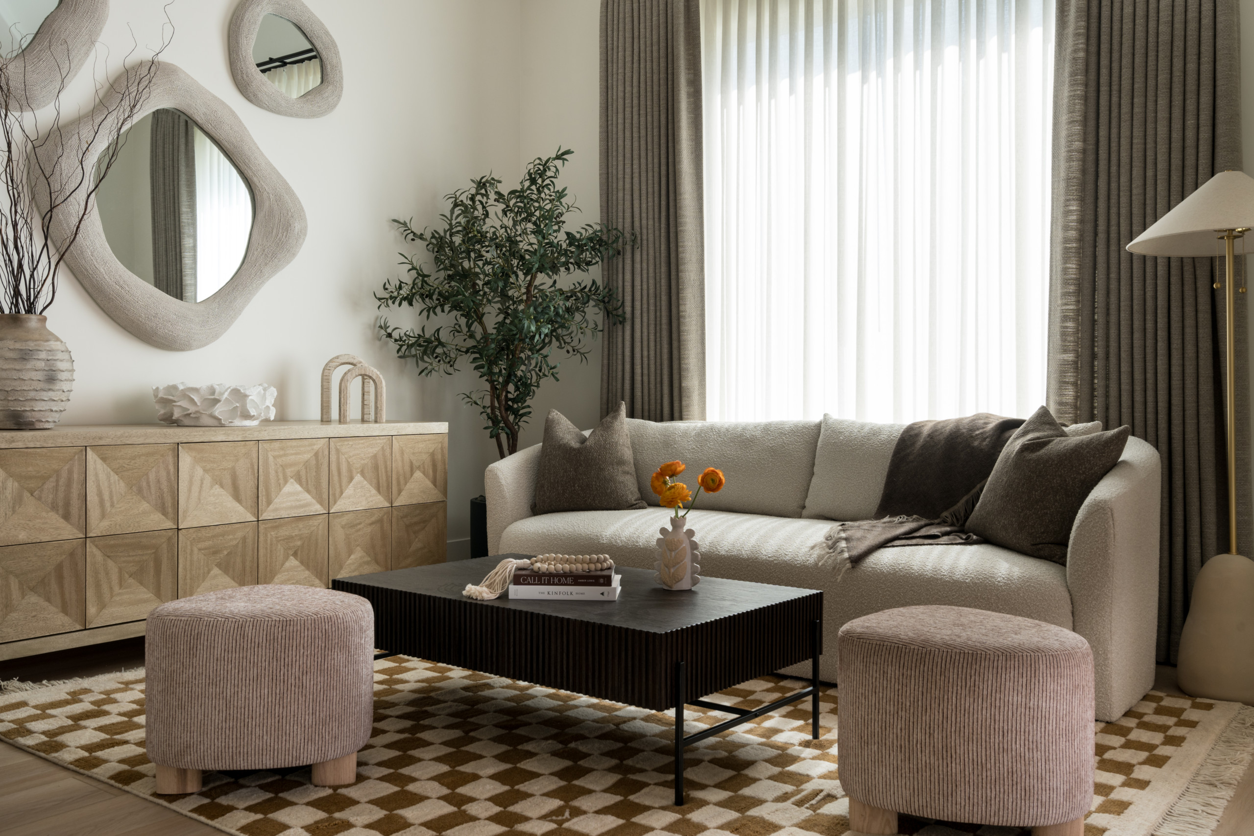 In this Los Angeles living room by Mark Design, curvy furniture, organic-shaped mirrors, a ribbed coffee table and arched console accessories highlight the trend. The shapes, palette and boucle sofa fabric also contribute to the room’s organic modern style.