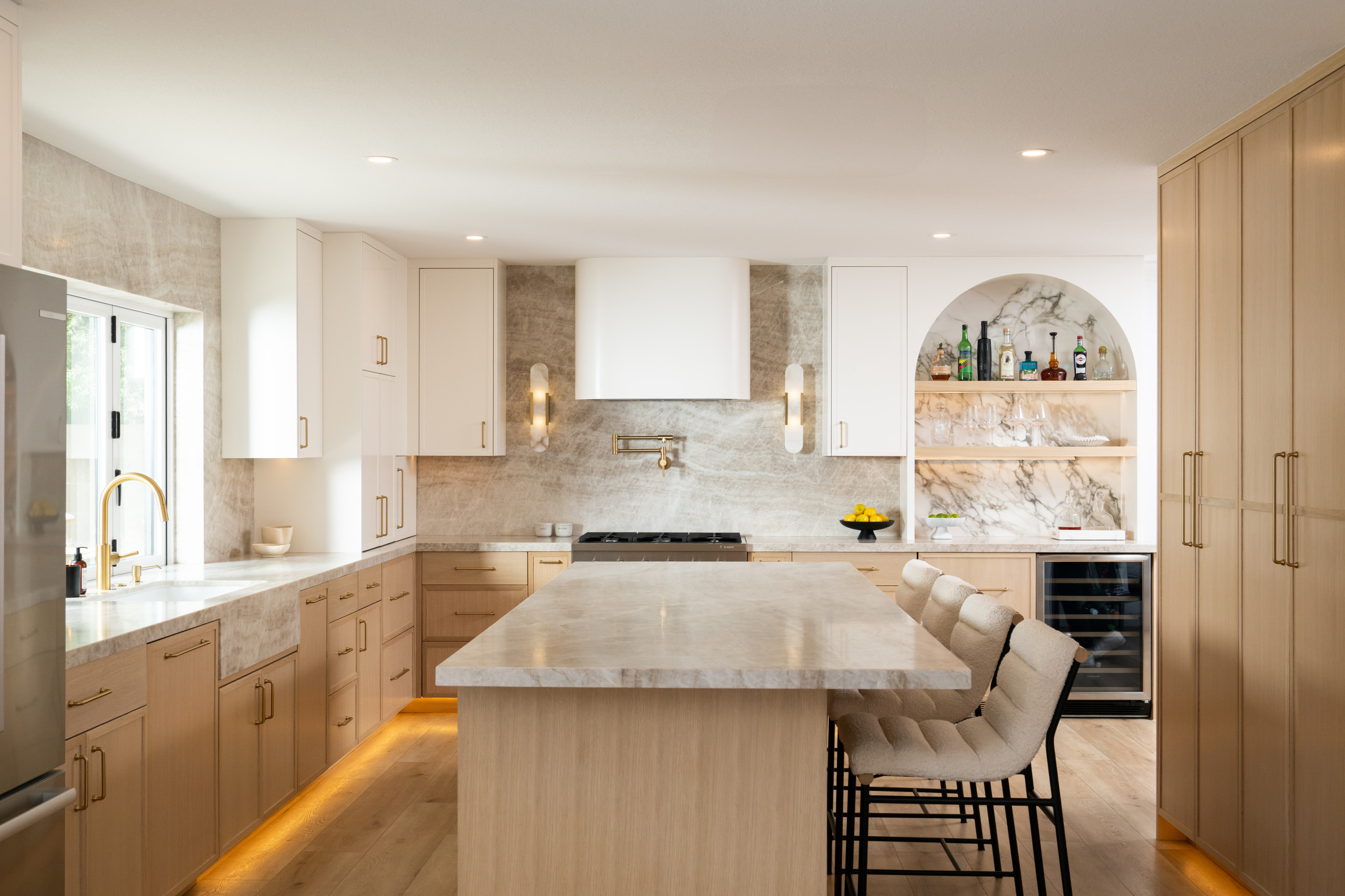 This Orange County, California, kitchen by OC Builders Group showcases organic modern style with light woods, natural stone, an arched doorway, a curved range hood and boucle-covered counter stools.
