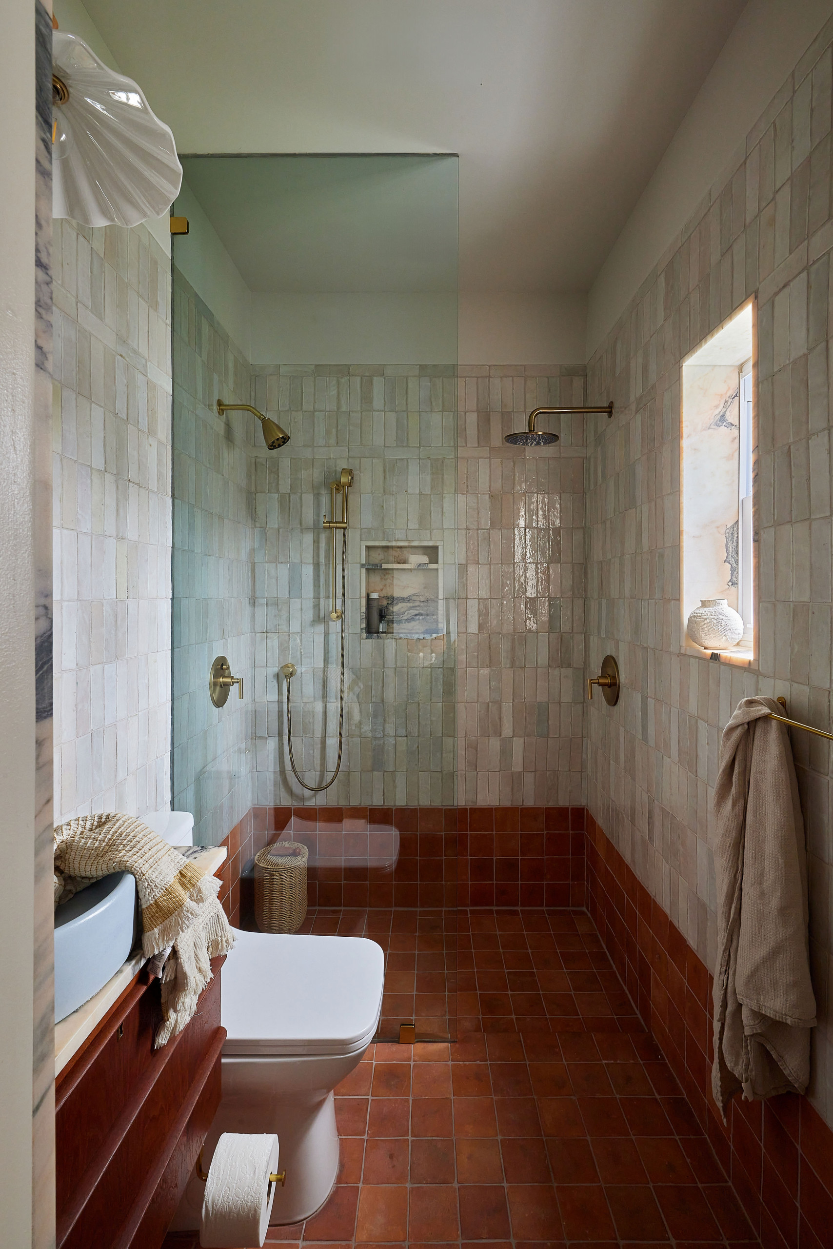 Rachel Gedymin Design grounded this New York bathroom with rich terra-cotta-colored floor tile. Creamy white zellige-style tile wraps part of the walls, enhancing the earthy look and feel.