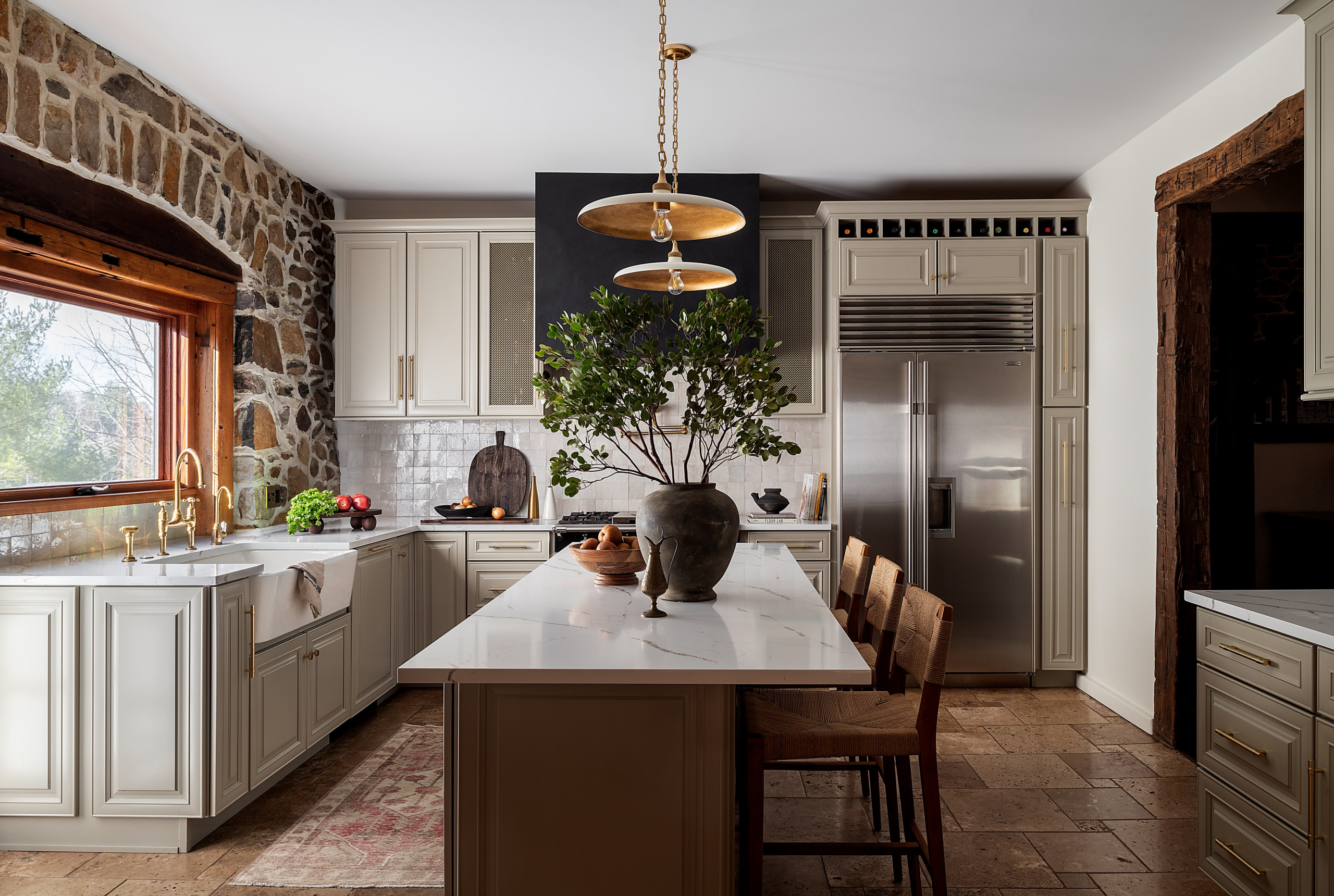 In this Philadelphia kitchen, Old Soul Interior Design & Renovation Studio combined textured tile flooring, a stone feature wall, raw wood accents, mesh cabinet fronts and woven stools to create a rich tapestry of tactile materials.