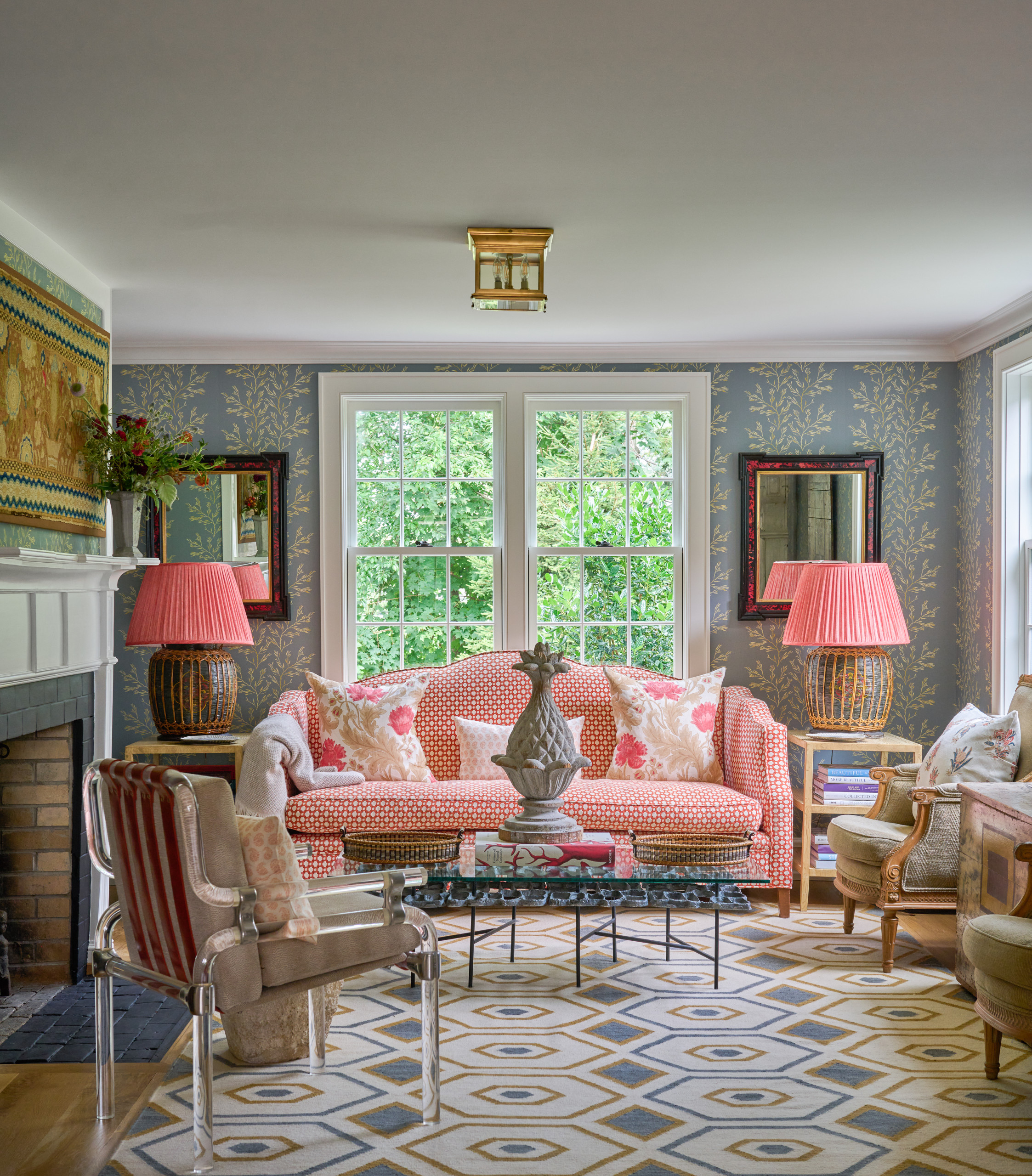 Vivid color and playful pattern infuse this New York living room from The Barns by Ali Mahon with charm and personality.