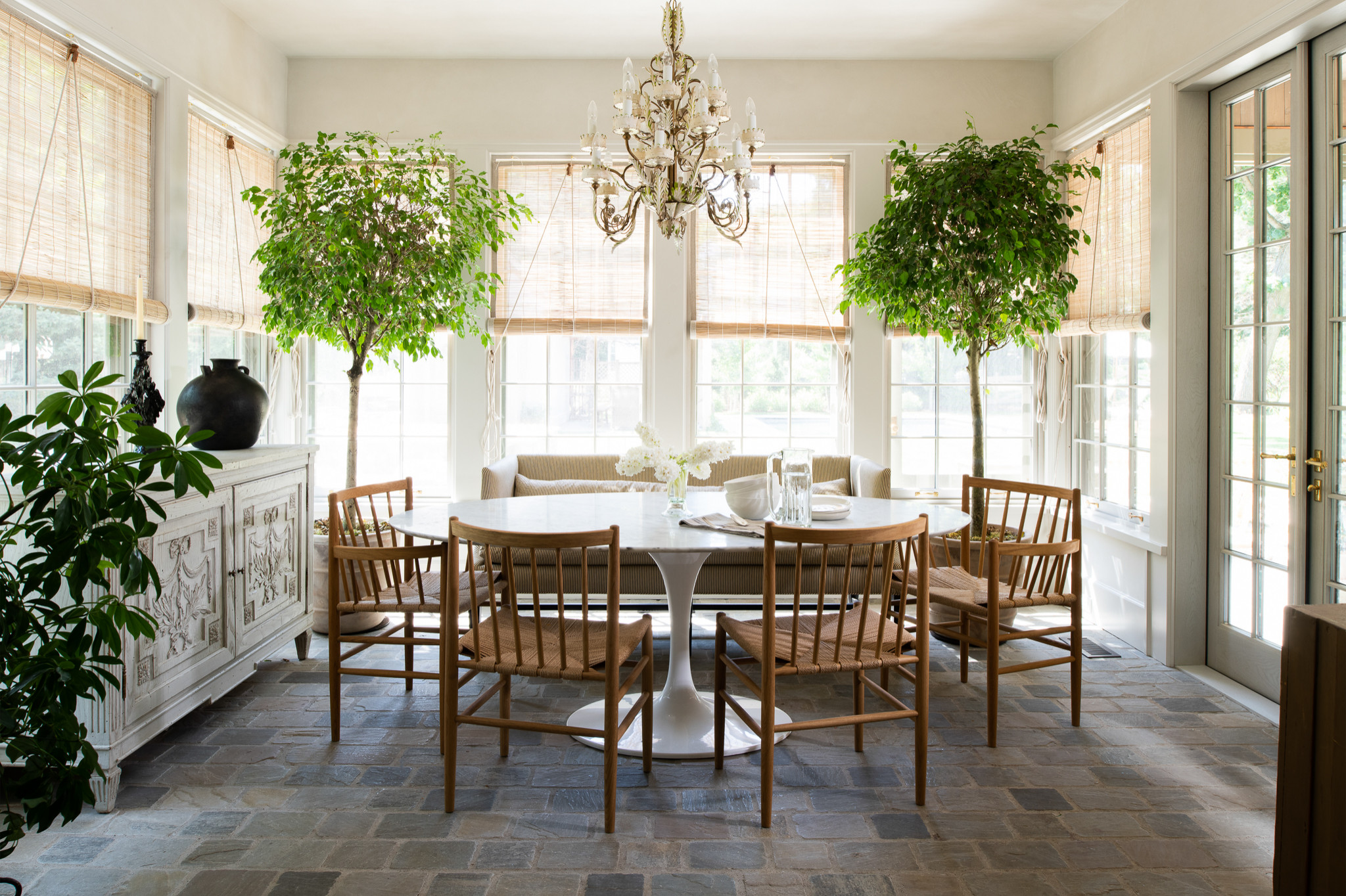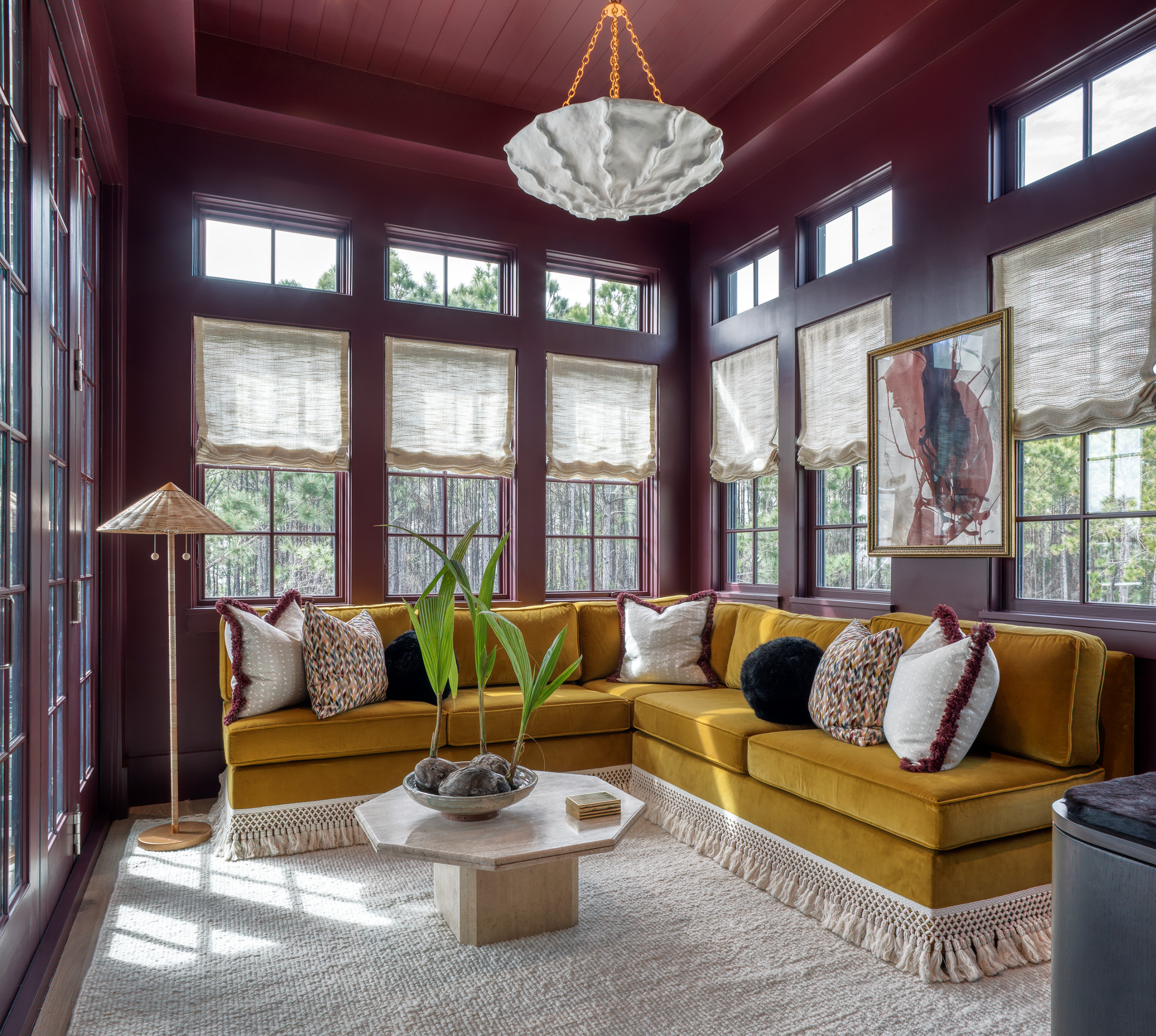Of course, summer isn’t the only vibe for a sunroom. In Miami, where it feels like summer outside almost every day, a cozy room with a wintry feel can satisfy a longing for seasonal changes. That’s the case in this Geoff Chick & Associates sunroom, where the walls and ceiling are drenched in rich plum paint and a custom sofa is adorned in deep golden velvet. Lighter colors on the window treatments, light fixture, coffee table and rug provide balanced contrast.