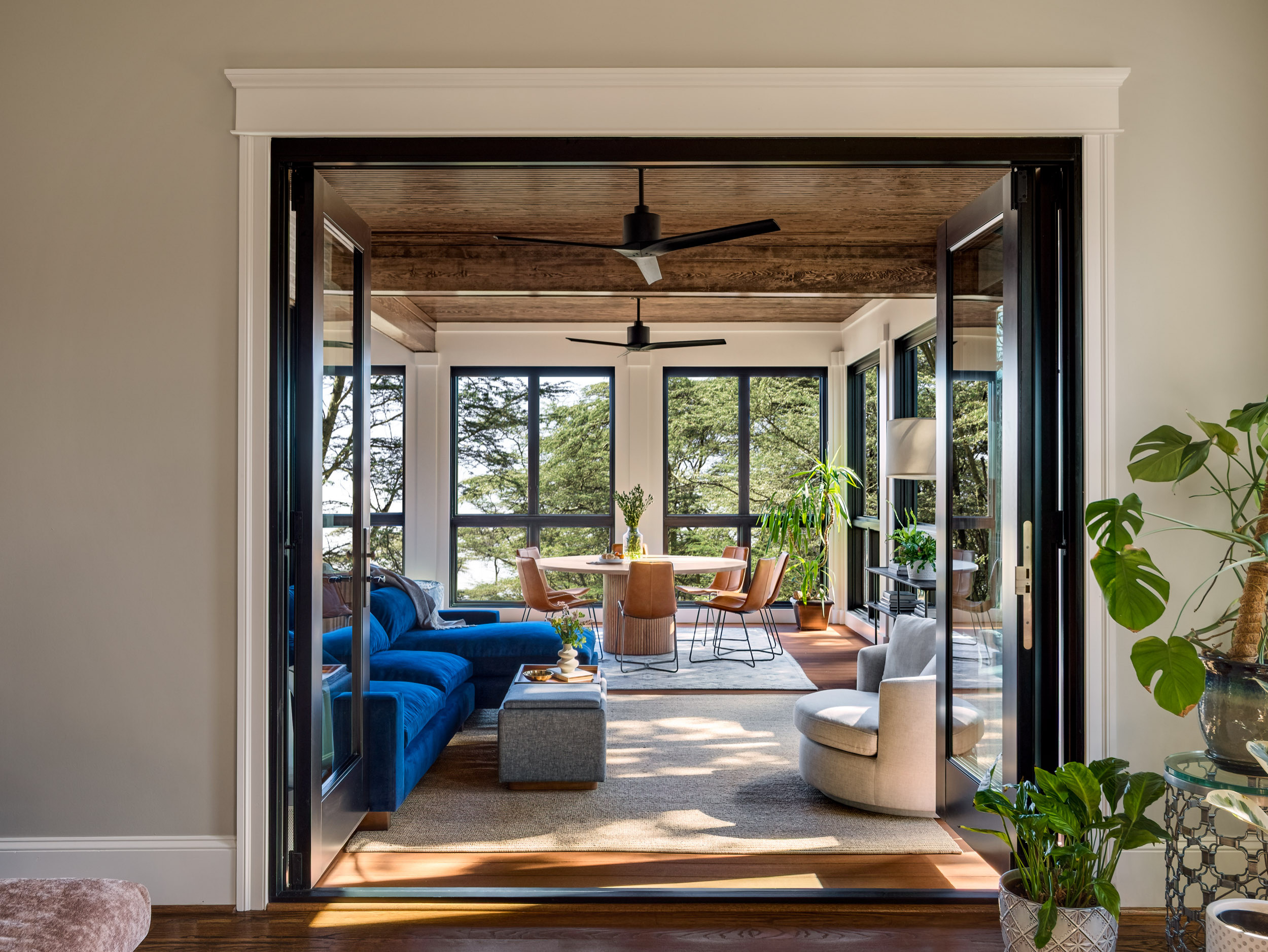 Some sunrooms enjoy a screened-in porch feel, yet they’re protected from the elements by windows. The extensive tree canopy views and the wood ceiling and floor give this northern Virginia sunroom a porch look. But because the room has windows instead of screens, the homeowners were able to furnish it with plush indoor furniture and elevated finishes that won’t be damaged by pollen, rain or snow.