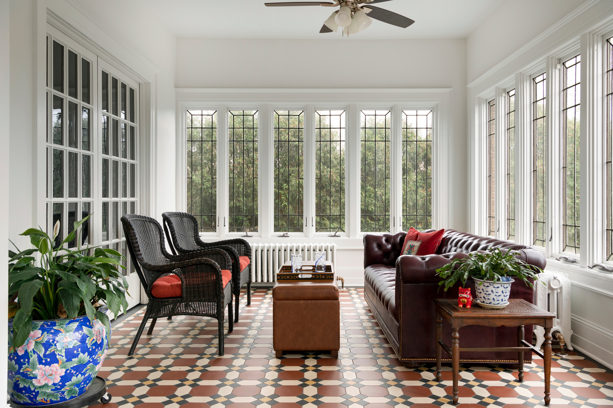 Often closed off from the rest of a home, a sunroom can offer an opportunity to make a statement on the floor. To complement this Minneapolis home’s 1913 roots, N Baker Interiors recommended a tile befitting the home’s historic architecture. This tile infuses the room with color, pattern and era-appropriate style.