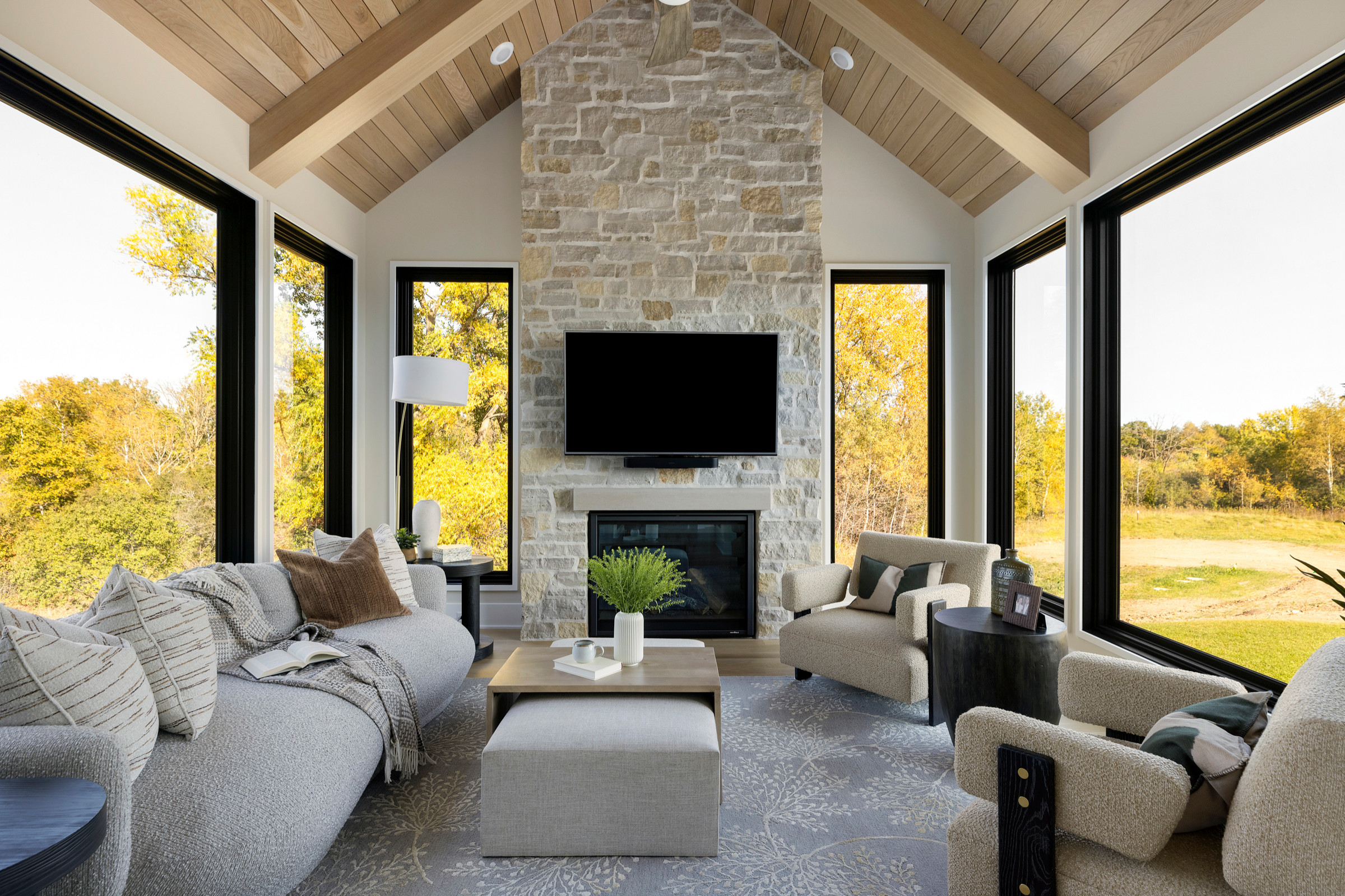During Wisconsin’s cold winters, a fireplace keeps this Cypress Homes sunroom feeling extra toasty. The stone fireplace surround serves as a focal point, and its cream, gray and tan hues provided a jumping-off point for the room’s warm organic color palette.