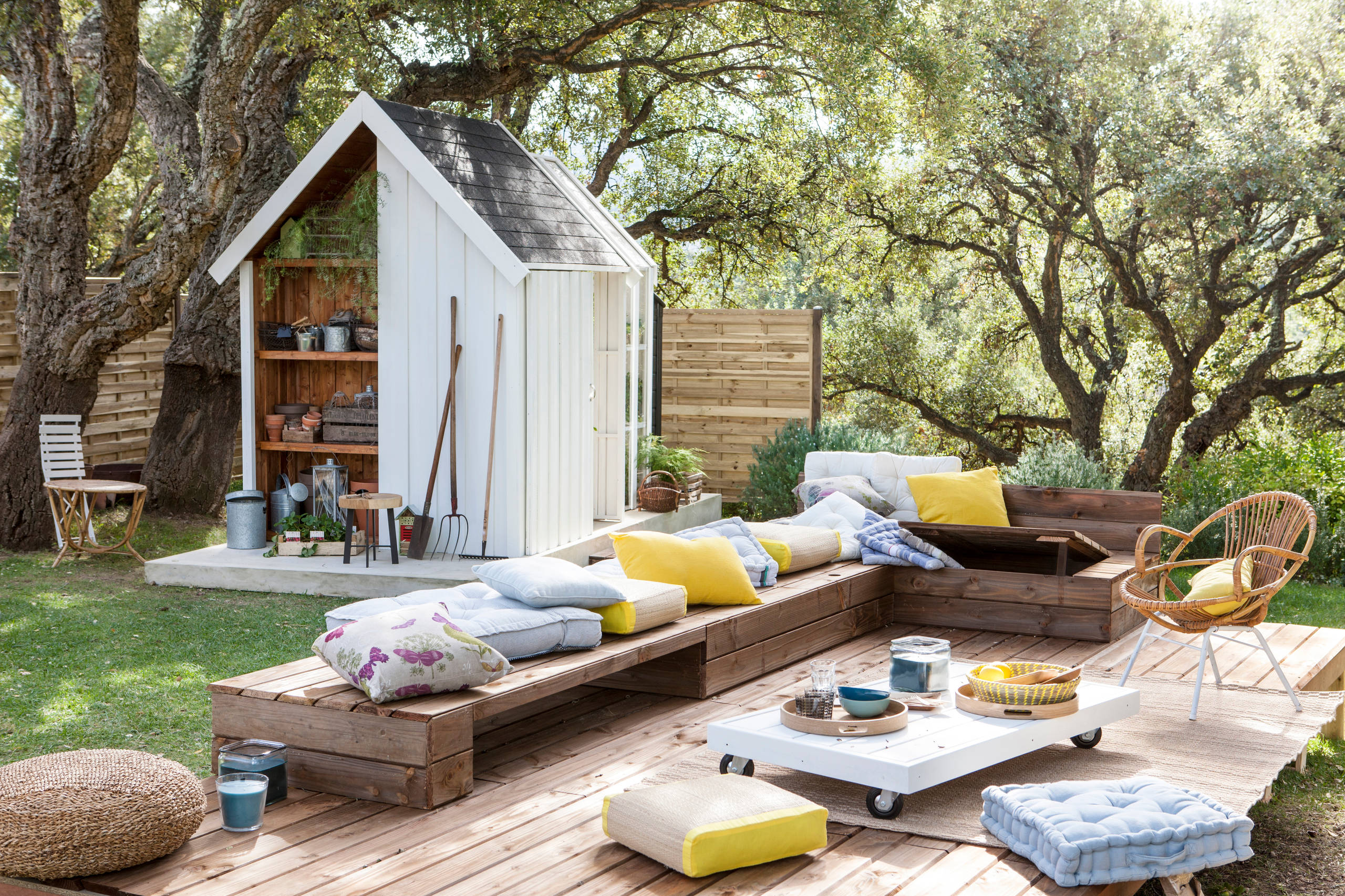 Bench seating with built-in storage keeps outdoor cushions protected from the elements yet ready to grab when you need them. A selection of thicker floor cushions can be used as extra seats to accommodate a large group, and a table on casters makes a portable surface for setting down drinks and snacks.
