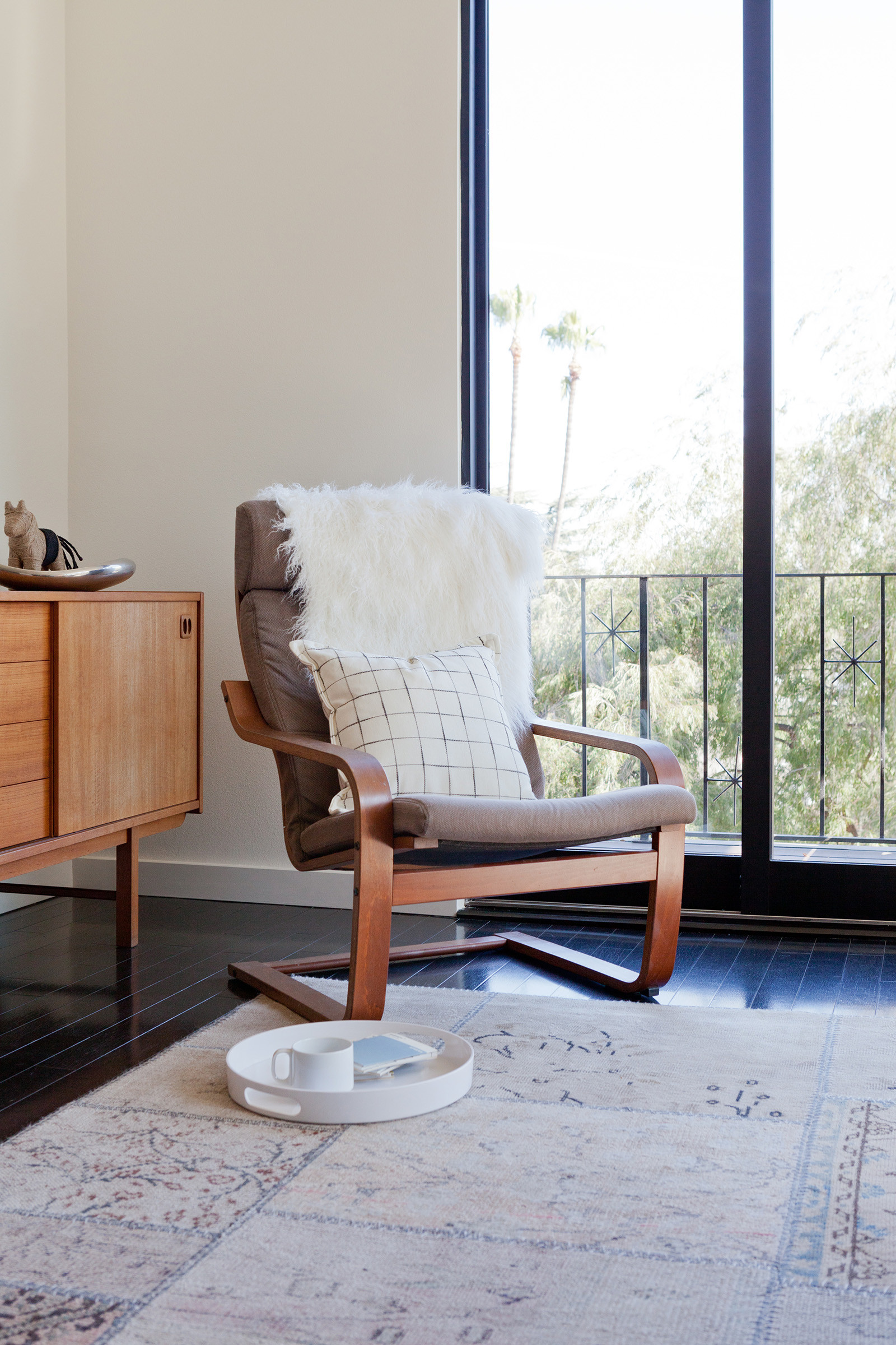 A round or rectangular tray with handles can be used as a bar setup for a party, a mobile coffee or hot-cocoa station, or a platform for displaying books and favorite objects on the coffee table.