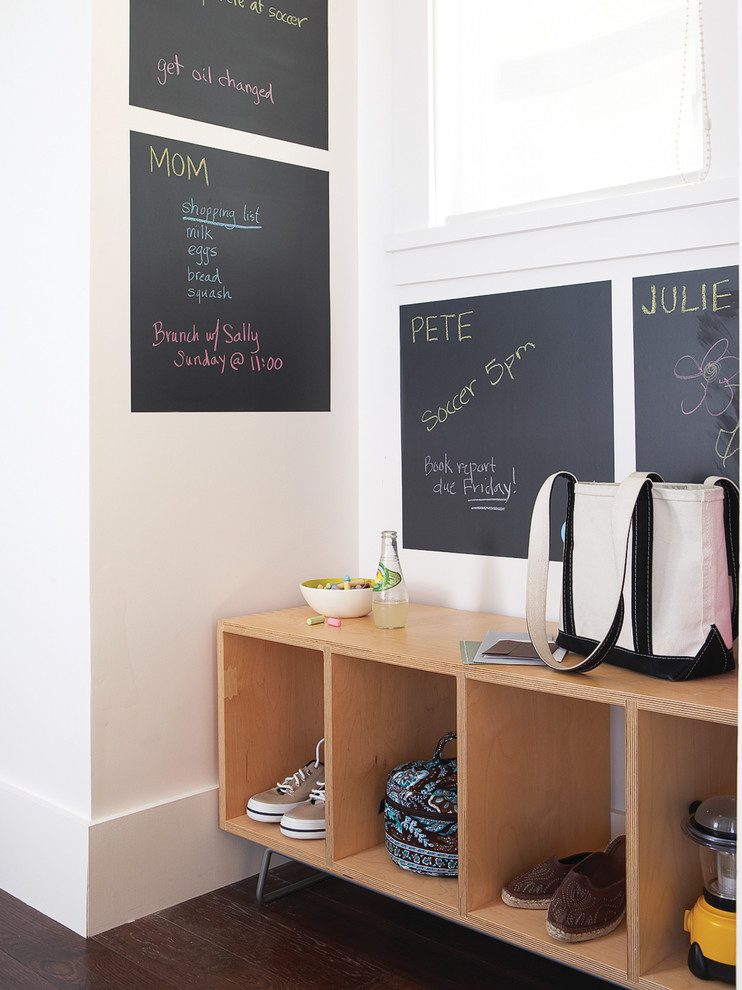 Even die-hard digital-note takers can use a physical message board in the mudroom. Use it to quickly jot down reminders for events, things you need at the store or notes for other members of the household. Choose a chalkboard or dry-erase surface, with or without a calendar.