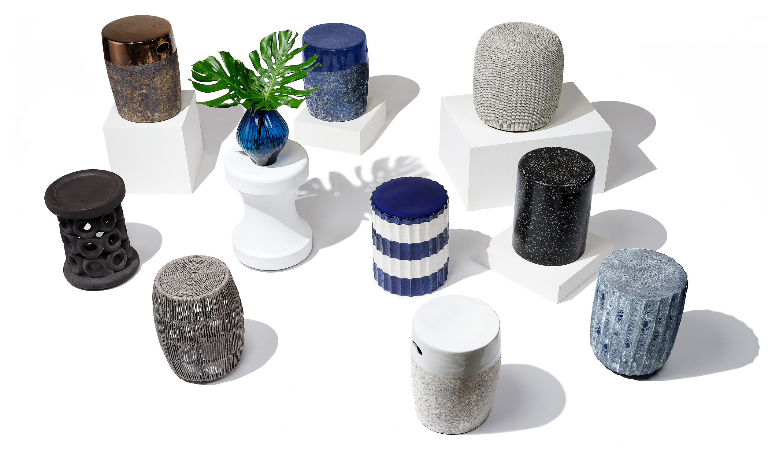This selection of Made Goods stools shows off some of the materials, textures and shapes that are on-trend this season, including rope and fluting.