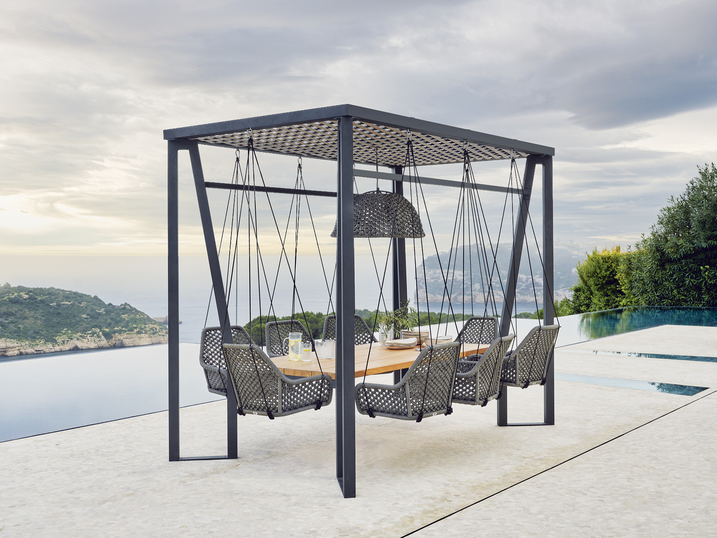 Front porch rockers and reclining poolside chaises have long been staples of outdoor furniture. But over the past couple of seasons, we’ve noticed an uptick in outdoor swivel chairs, recliners and other dynamic lounge and dining seating in both indoor and outdoor collections. The Horizon pergola dining set from Skyline Design North America, which debuted earlier in the year and now comes in this model that seats eight, was one attention-getter in the bunch at the spring market.
