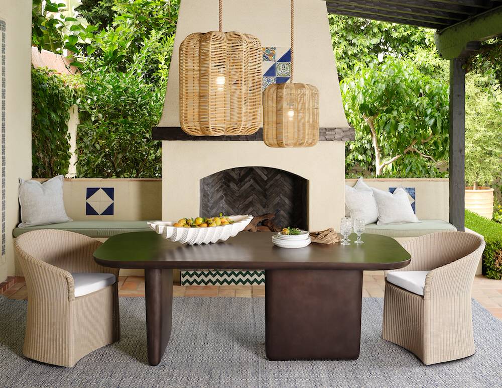 This photo of a covered patio encapsulates many of the latest trends in outdoor furnishings, in terms of shapes and materials as well as colors. And as you can see, the whole ensemble of new-for-2024 Made Goods furnishings — which includes the bronze reinforced-concrete Payton dining table, faux rattan Deborah swivel chairs and Bevan chandeliers, and a hand-woven Manolo rug made of performance yarn — could be picked up and put into a living room and look right at home.
