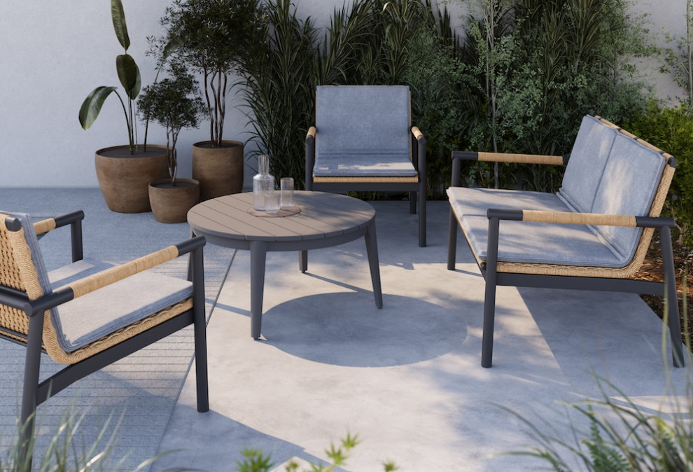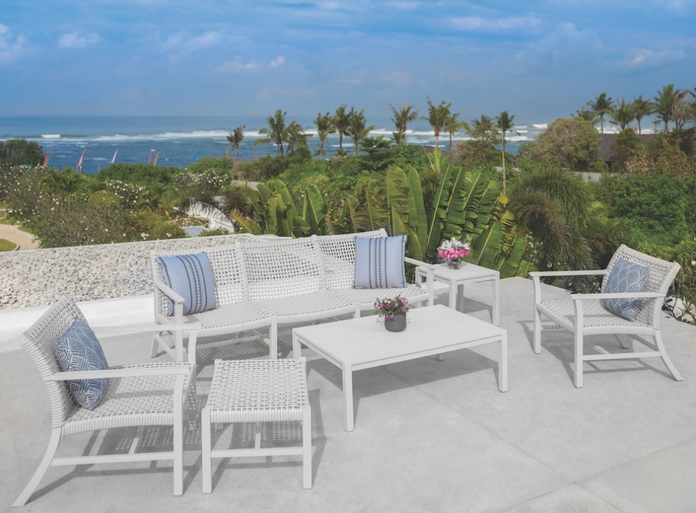 Another example is this Kingsley Bate Catherine collection, which comes in teak or powder-coated aluminum frames and has seats and backs made of all-weather wicker. The weave’s extra-large strands and geometric pattern offer enough give to eliminate the need for cushions. The overall look is lighter and airier than a seating arrangement made of teak and thick cushions.